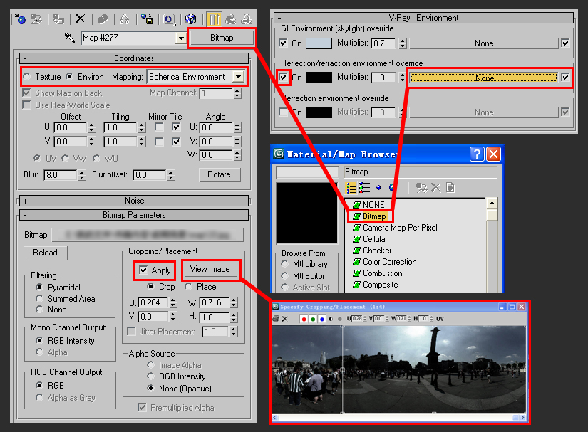 打开渲染命令面板,选择VRay渲染器,在【Environment(环境)】选项中提供了一个可以直接控制全局反射效果的功能。为反射环境添加一个环境贴图。设置为球形环境贴图方式