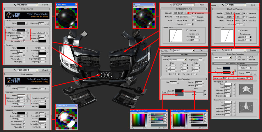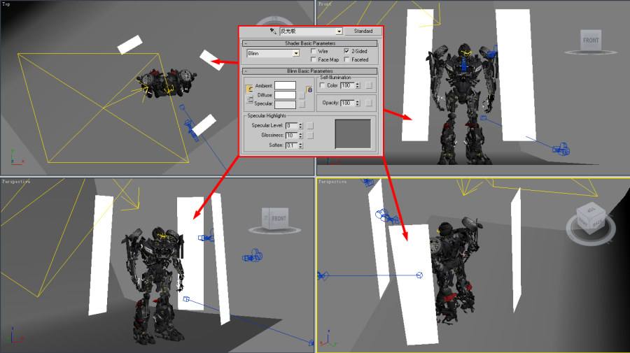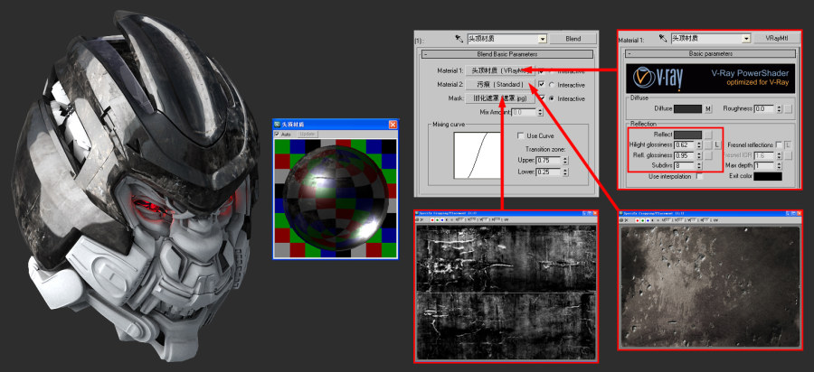 为角色制作材质效果,以头部举例。使用【Blend(混合材质)】制作。1号材质是Vray的标准材质。这个材质要求和汽车的外壳材质类似。确保变形成机器人后能和汽车车漆材质相呼应。在其【Diffuse(过渡色贴图)】上添加一个衰减贴图。2号材质是3ds max的标准材质。在【Diffuse(过渡色贴图)】上添加一个旧化效果贴图。在3号材质【Mask(遮罩)】的作用下,可以混合1、2号材质。并得到最终的材质效果。