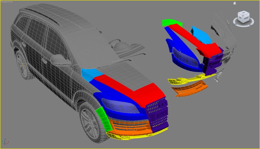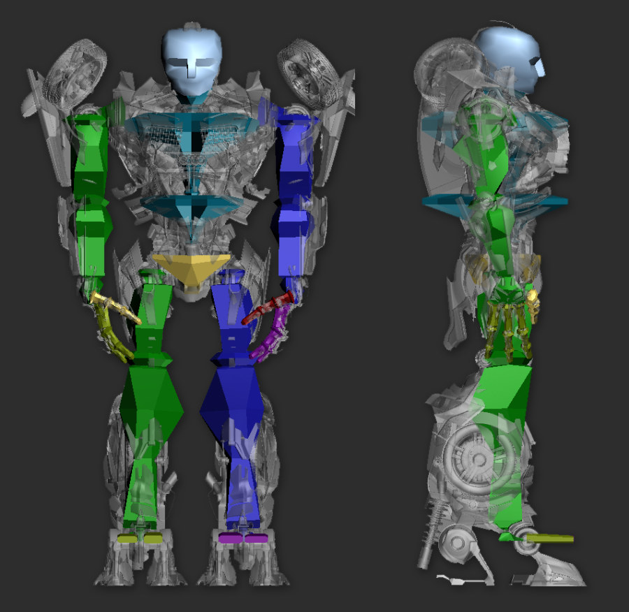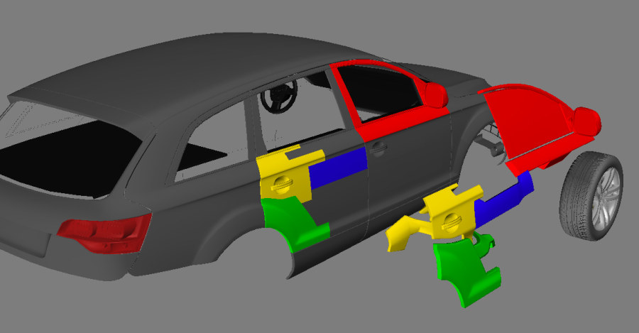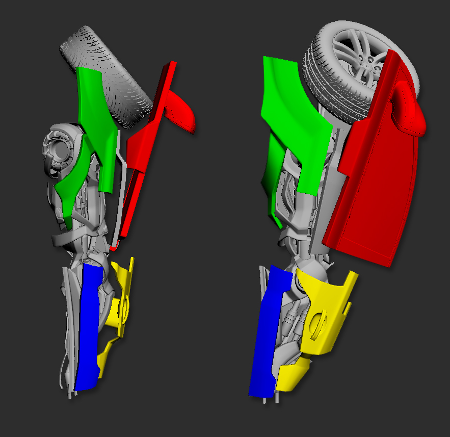 首先需要把汽车模型进行拆分。把可以用在角色身体部分的外壳切分出来,并拼合成符合角色身体结构的形状。