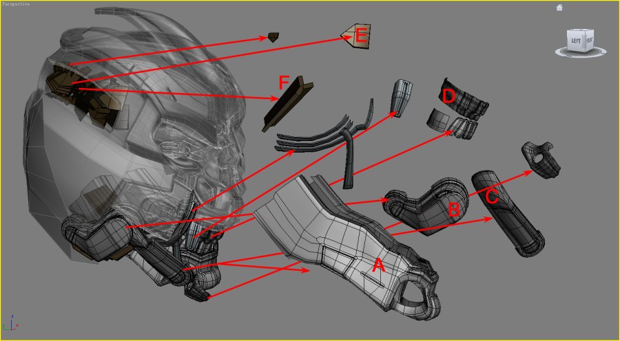 创建角色的头部,根据设定稿为模型布线,把大的体块切割出来,然后逐一的进行细化。遵循着整体到局部再到整体的制作流程,运用poly建模工具完成制作。