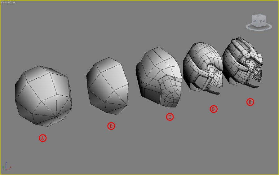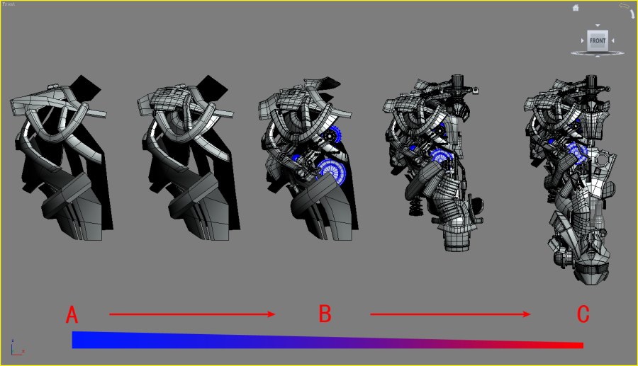 完整身体的制作过程,如图 “A”到“B”,是一个由外到内的制作阶段,模型在调整整体造型的时候在逐渐缩小。这个过程类似绘画,起稿绘制的是大轮廓,逐渐在大轮廓内进行细分,最后去掉边缘多余的轮廓线。实现模型的设计效果。