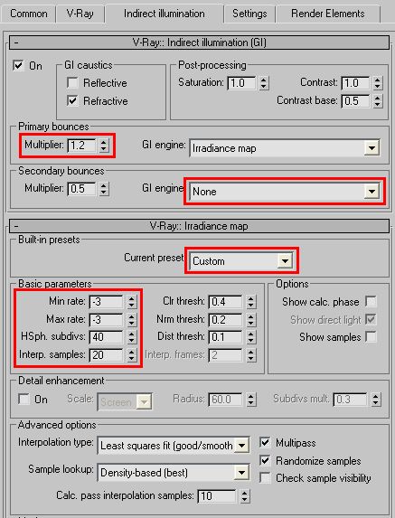 打开【Indirect illumination(间接照明)】面板,设置参数。此参数为单帧效果设置。如果设置动画渲染,需要调整部分参数。否则会出现动画闪烁现象。