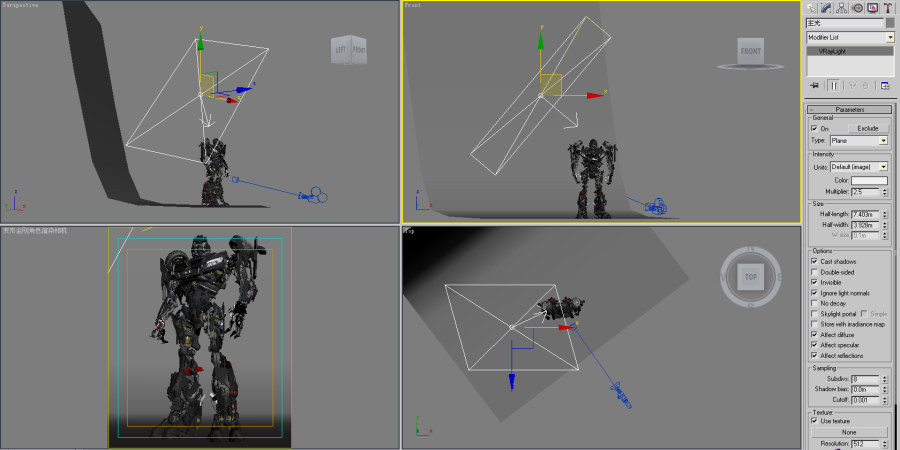 创建基本场景后,为其添加灯光。这里使用的是VRay面光源。可以提供良好的阴影质量及照明效果。