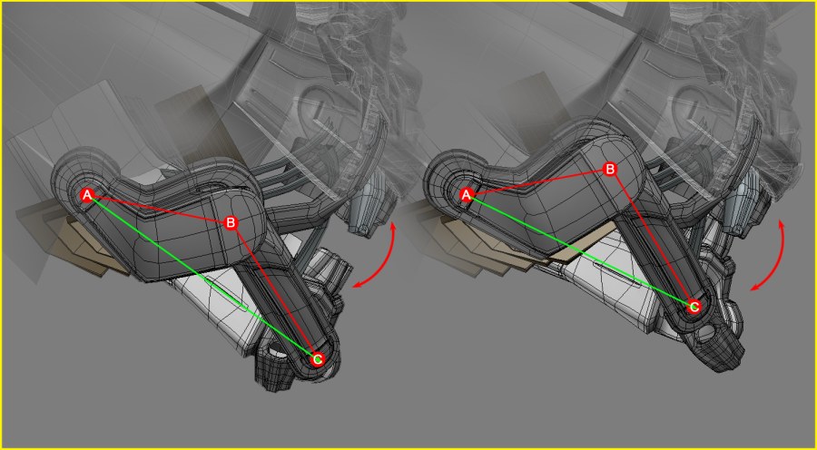 使用character studio角色系统,为模型进行骨骼绑定。与肌肉结构组成的角色骨骼绑定不同的是,变形金刚角色是由金属零件构成的,因此完全是刚性骨骼绑定。