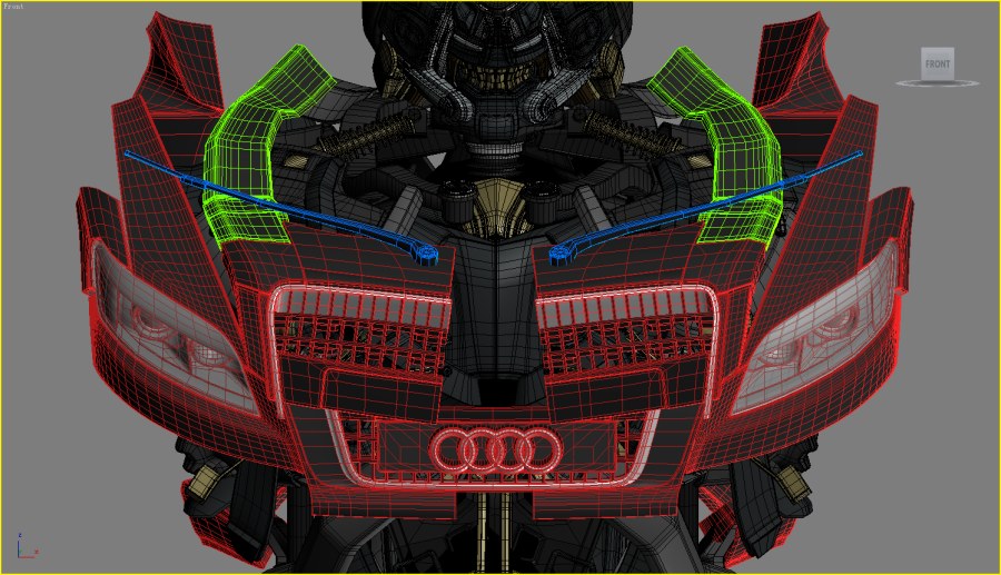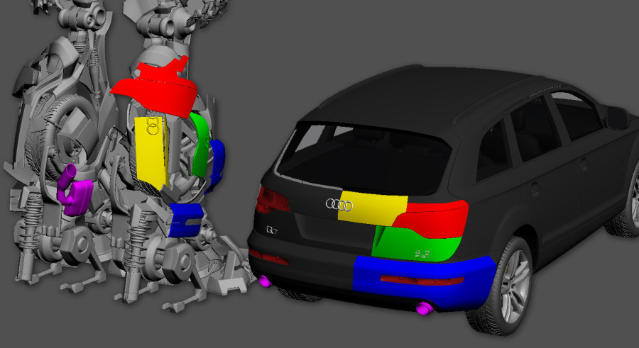 变形金刚具备两个形态,机器人形态和载具形态。由于笔者设计的角色定位于狂派,并且擅长巷战,为了更好的伪装隐藏,将其设定变形为奥迪Q7的SUV商务车。