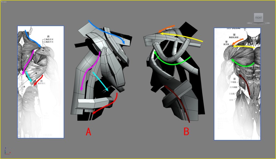 在制作身体的时,重点放在整体造型的感觉上,对模型的大体轮廓可以参考人体肌肉图。蓝色线标示着一组模型的结构造型,可代表人体肌肉的斜方肌。紫色线走向勾画出背阔肌的造型。浅蓝色线所指,要破坏下肌肉关系的格局,不要刻意的强调肌肉的关系而疏远了模型本身的个性。红色线代表着腹外斜肌,从正面腹部到后背的一块肌肉。此时可以把模型夸张改变。做到合理美观。