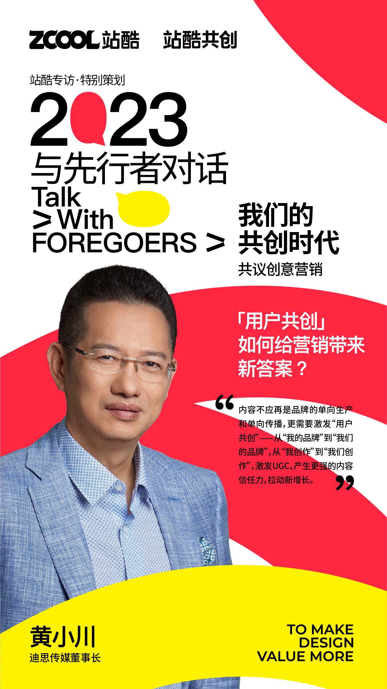 2023年,站酷推出特别策划——「2023,与先行者对话」,共议共创时代下的创意营销。本期分享人:迪思传媒董事长黄小川。
