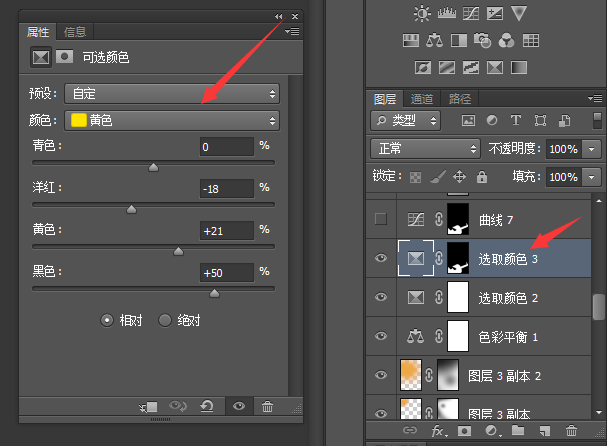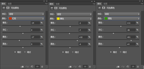 接下来进行调色步骤!新建可选颜色调整图层,对红黄绿三种颜色进行调整!