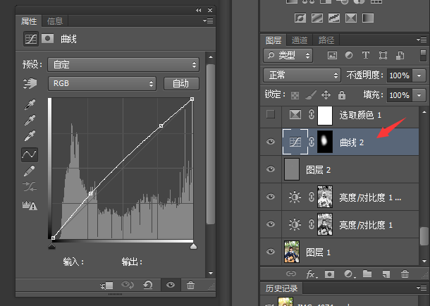 接下来将亮度对比度调整图层复制一层,按住Ctrl+I将其反相,这一步还是提亮背景。