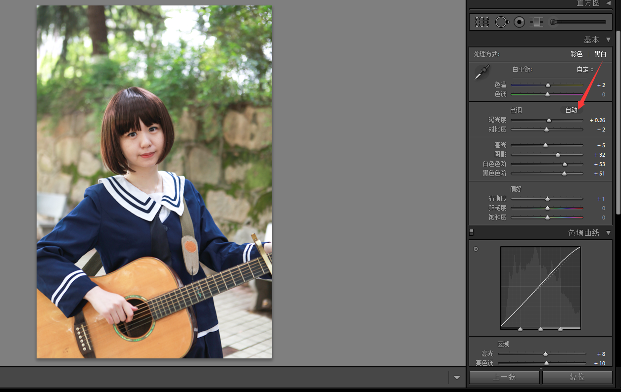先将图片导入LR,将阴影、白色色阶、黑色色阶往右移动,具体数值根据照片而定,这一步将背景提亮,而且最大程度的避免了影响到人物本身亮度!