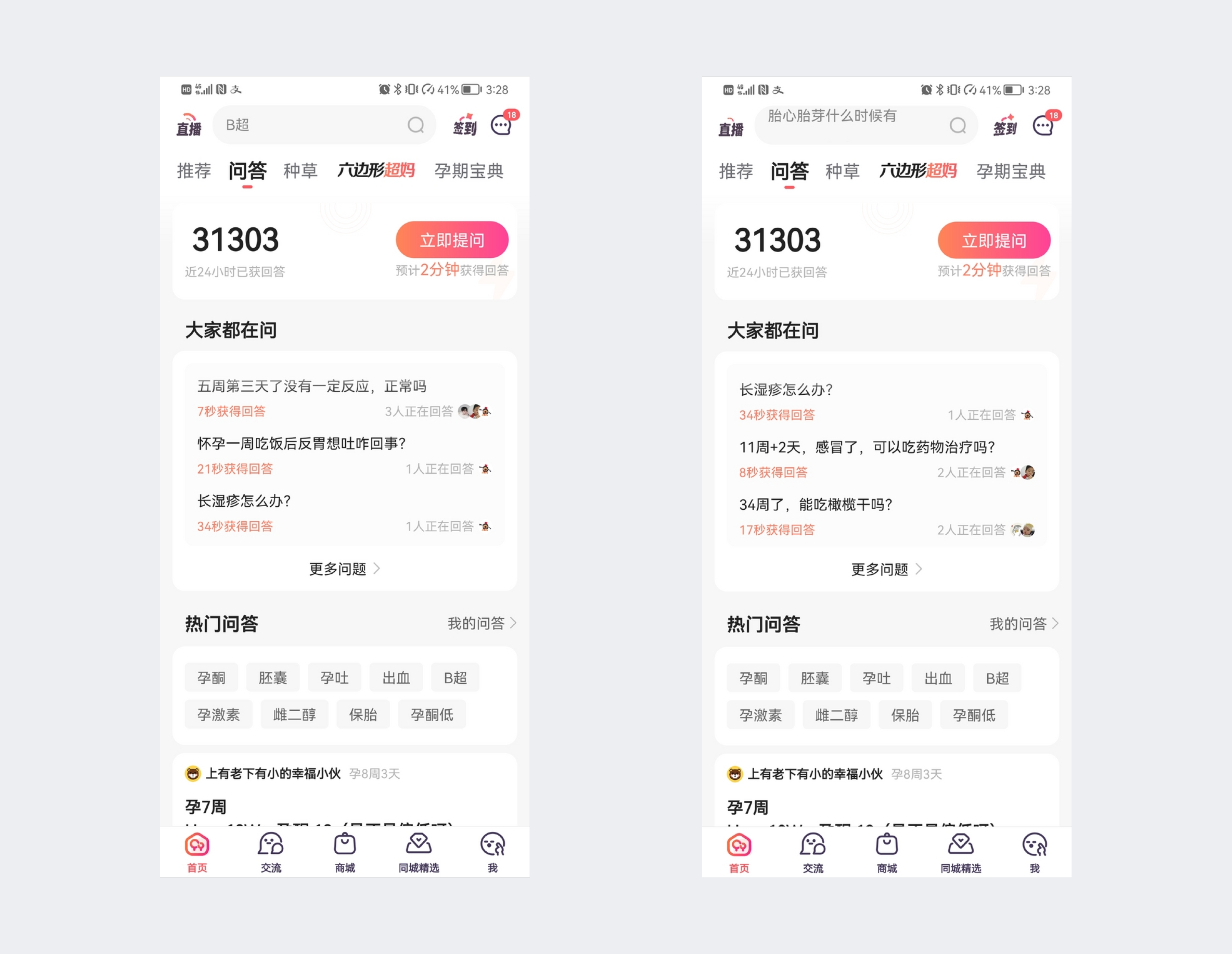 一方面,宝宝树的提问滚屏解决了在有限空间如何更多的展示提问数量的问题。滚屏的使用使得问题的露出达到最大化,静态的模块展示只能让用户看到三个问题,动态的展示用户能看到的问题远远不止三个。更多问题的露出也能吸引用户浏览,促进转化。另一方面,提问滚屏展示了用户的实时提问和回答情况,渲染了社区活跃的氛围,营造了用户积极提问的盛况。大部分用户都有个从众心理,越多人参与就越想凑热闹。问题的高参与度也会提升其他用户提问的意愿,用户也会更加主动的参与到问题的提问和回答上。