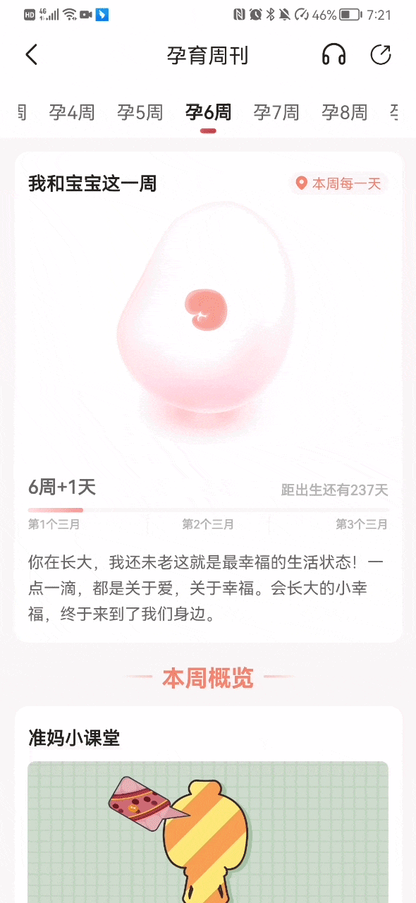 宝宝树绘制了生动形象的插图来表示孕周胎儿的变化,并且当用户手指触碰插图,子宫会出现q弹的动画效果和渐变的呼吸效果,胎儿也会有轻微的位置游移变化。