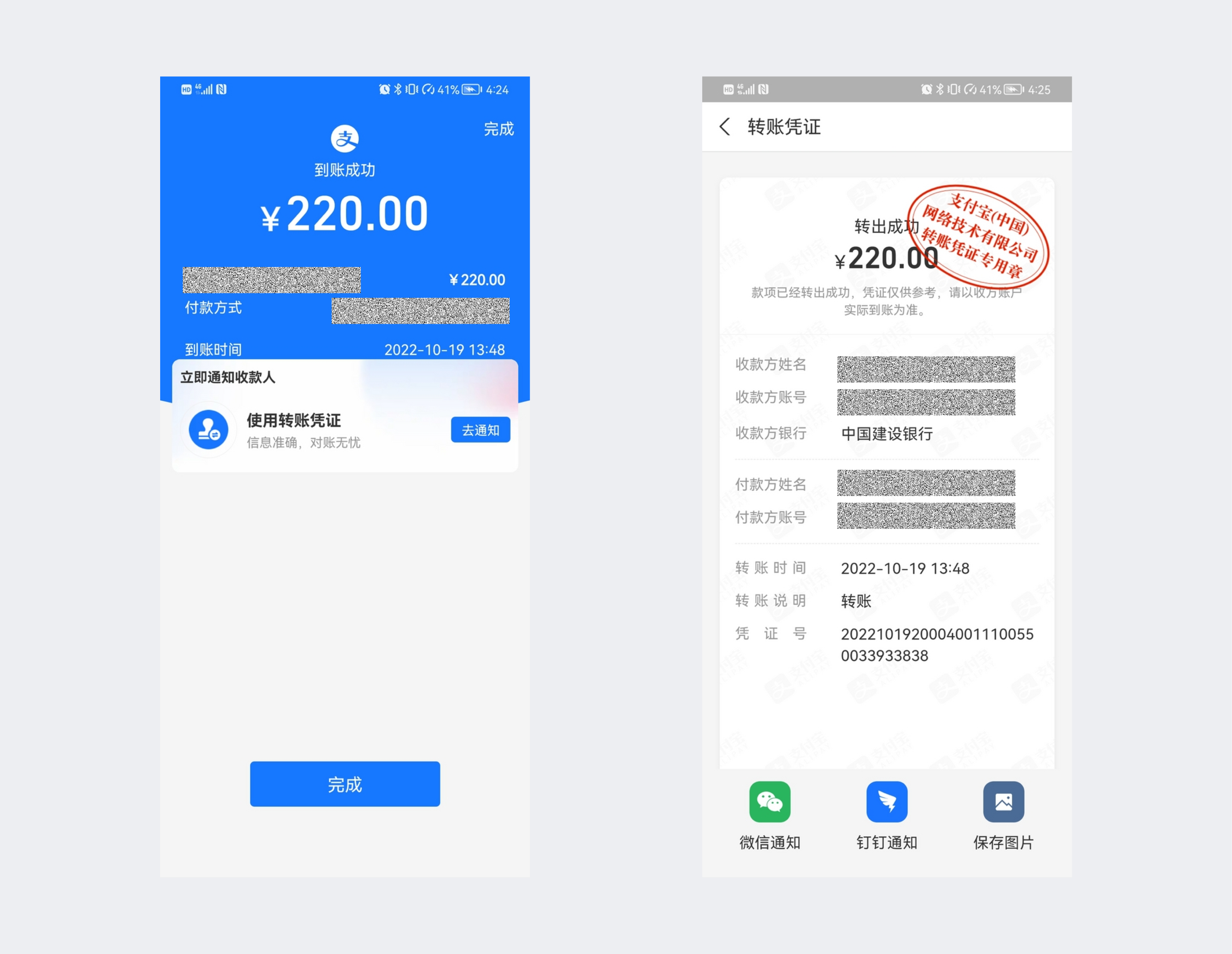 用户转账完成后,转账成功的界面不仅体现了转账的金额及付款方式等,还附带一个通知收款人的快捷入口。