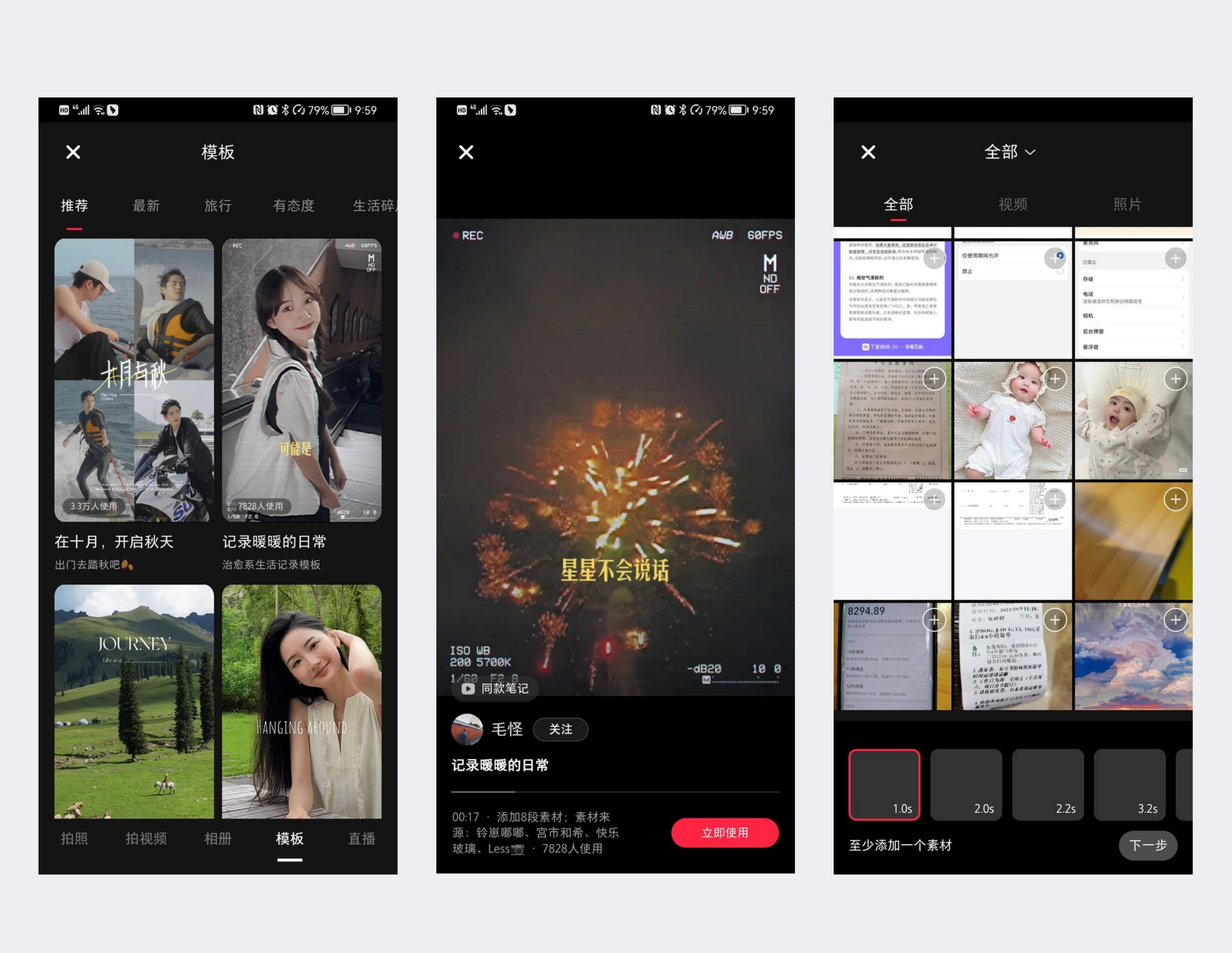 小红书用户在发帖时可选择喜欢的视频模板,进行简单的添加图片便可制作出一个精美的短视频。