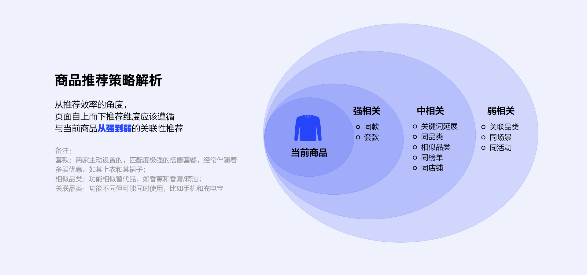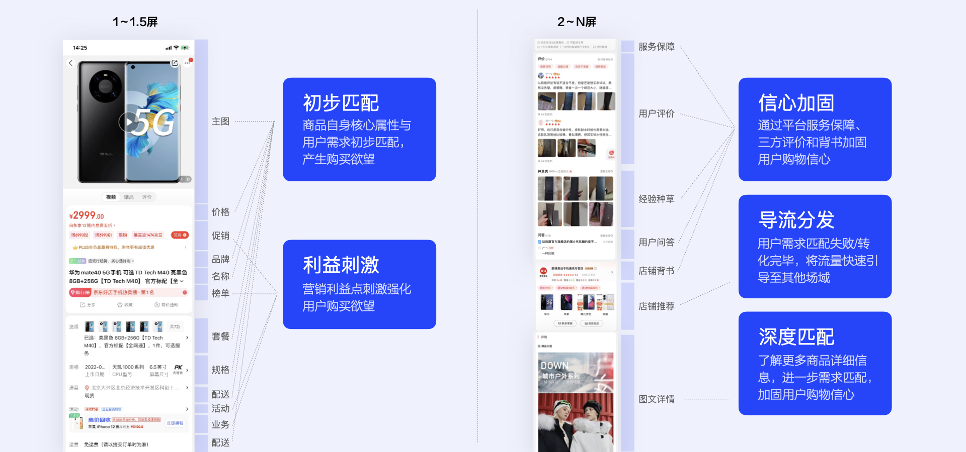 除了行为逻辑范式的横向串联,我们也可以针对某个关键决策阶段进行纵向拆解。有些决策行为并非固定在某一个节点发生,而是在浏览整个页面时随时可能触发,比如商详页“导流分发”阶段,用户在浏览商详时随时都可能对当前商品失去兴趣,因此对其他商品的导流会穿插在页面多个模块。这种复合决策场景可以单拎出来进行统一策略制定,再以新的策略重新审视线上方案合理性。以商详推荐导流模块为例: