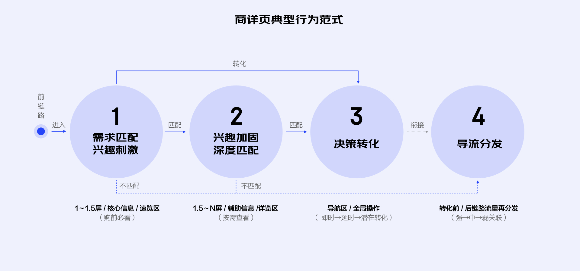 上一个步骤中,我们通过用户意图拆解获得了页面中的主次场景任务,下一步需要将这些任务串联成有逻辑的故事线,即抽象出用户在当前页面的典型行为范式。这个范式描述了用户决策所经历的几个重要阶段,反映了完整的用户意图变化过程以及促成变化的关键因子,由此我们可以系统地定位每个信息/功能/模块在用户决策中所起到的作用(决定优先级),进而推导合理的页面布局和浏览动线。行为范式可以使用流程图表达,包含关键决策阶段、步骤说明、逻辑判断关系等。以商详页面为例: