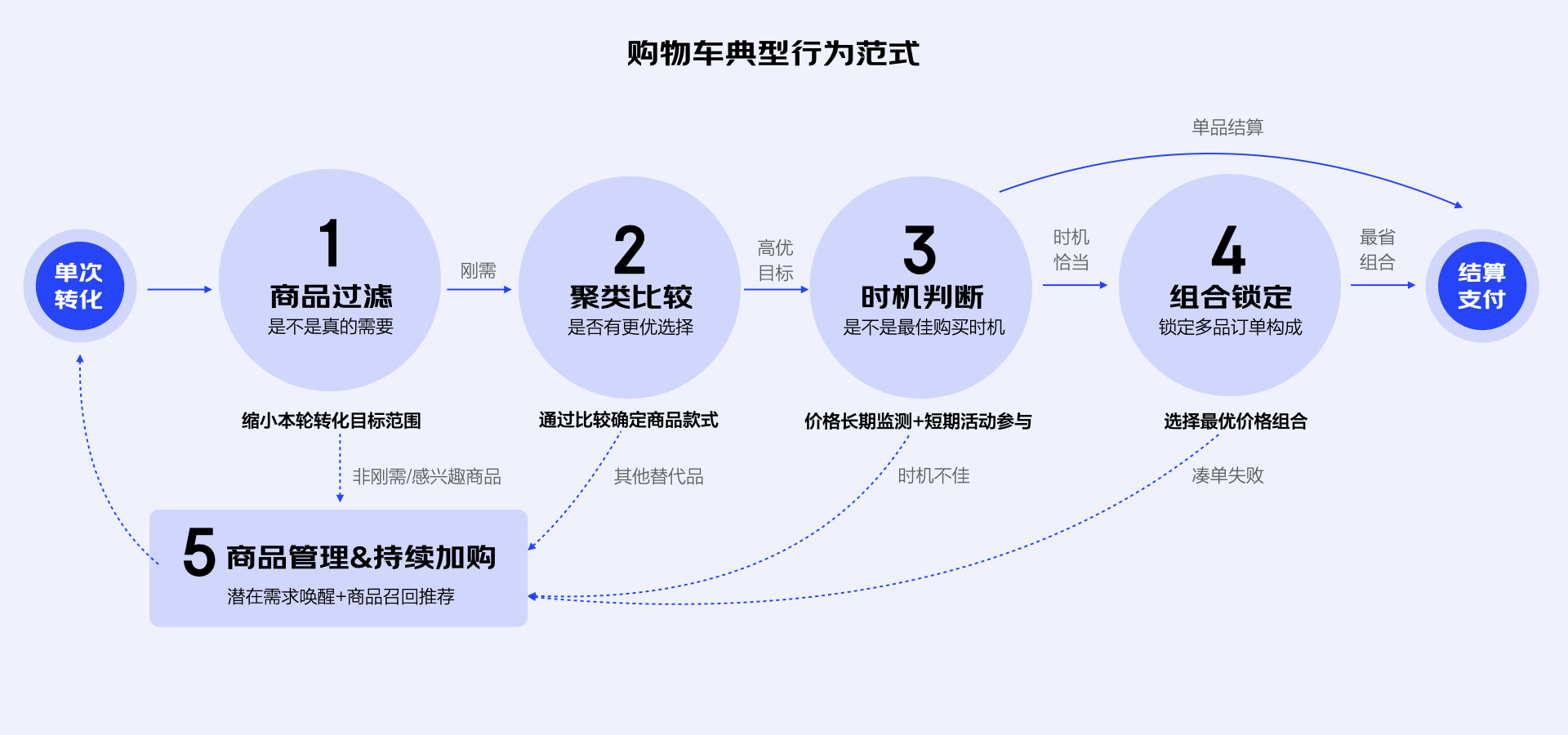 梳理页面行为范式时我们尽量缩小场景范围,聚焦于用户单次访问和转化的过程,排除分支流程的干扰(比如反复跳入跳出页面,或者持续周期很长的复访行为),提取用户在页面中最完整、通用的行为动线。以购物车页面为例: