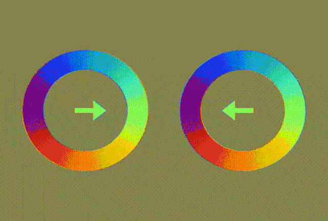 看上面这张图,两个圆环有没有跟随箭头方向移动、挤压、缩放?实际上圆环的位置并没有移动。之所以感觉它在移动是因为圆环的色度变化创建出了一个无缝的、永不休止的运动场景,让我们感觉两个圆环在始终变化,形成了一种“旋转版”的似动现象,其实是一种视错觉。