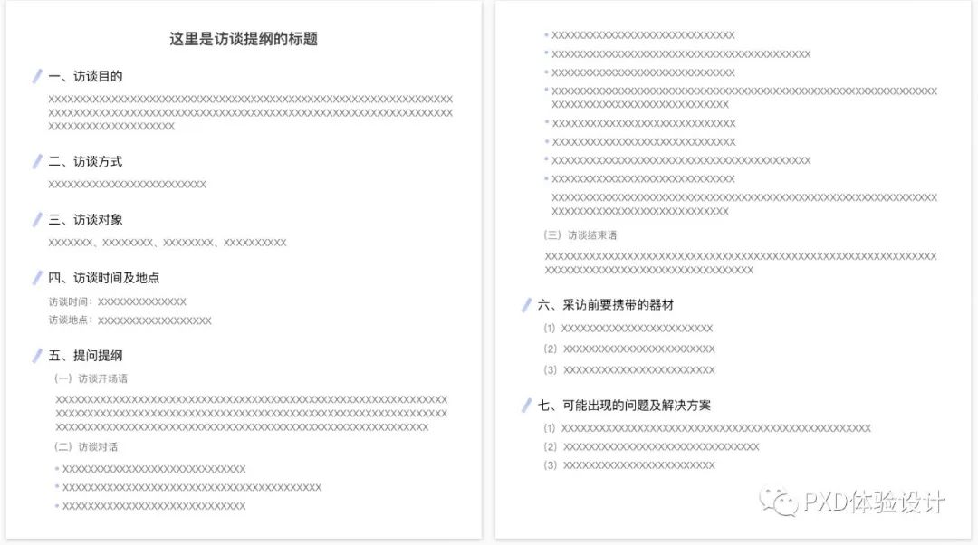 访谈提纲主要作用是记录访谈的背景信息以及预先准备好的问题,一方面在访谈时充当备忘录的作用,另一方面也方便他人阅读时快速了解访谈发生的背景与条件。访谈提纲一般由访谈目的、访谈方式、访谈对象、访谈时间及地点、提问提纲、采访前要携带的器材、可能遇到的问题及解决方案。如图: