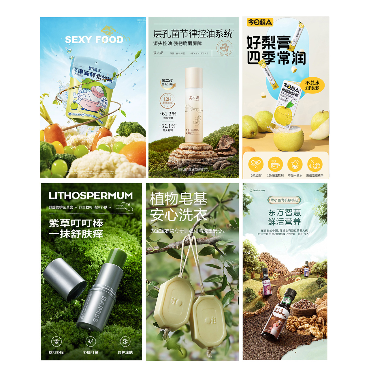 体现成分原材料比较适合于0添加,添加少,天然,植物,产量少或名产,主打原材料为卖点的产品,表现可以是室内静物搭配,也可以是户外的,根据自己的实现的难度和时间自由选择合适的方式,总之如果主打成分卖点,首屏就用这种体现方式,准没错!