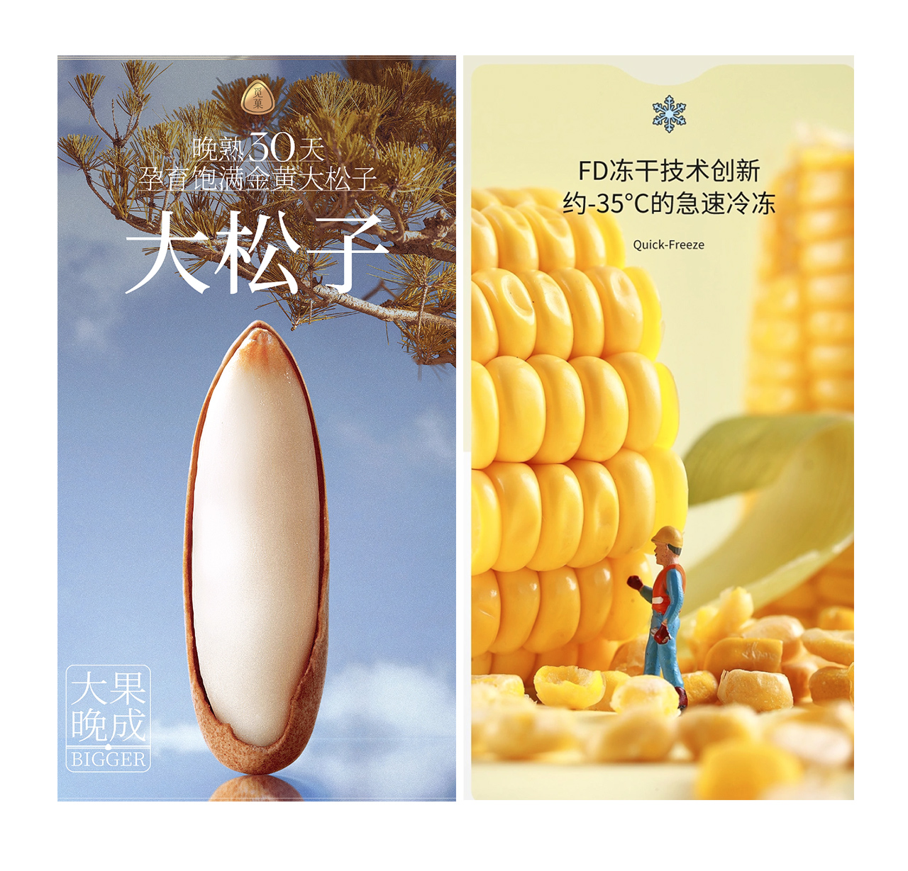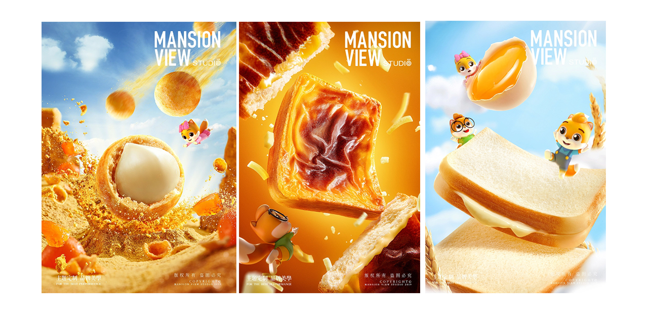 3只松鼠这一组创意海报也是通过放大产品的手法处理,放大产品的同时加入了一些动态效果,使画面更有场景感,张力瞬间拉满