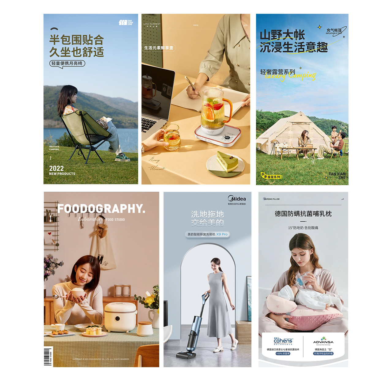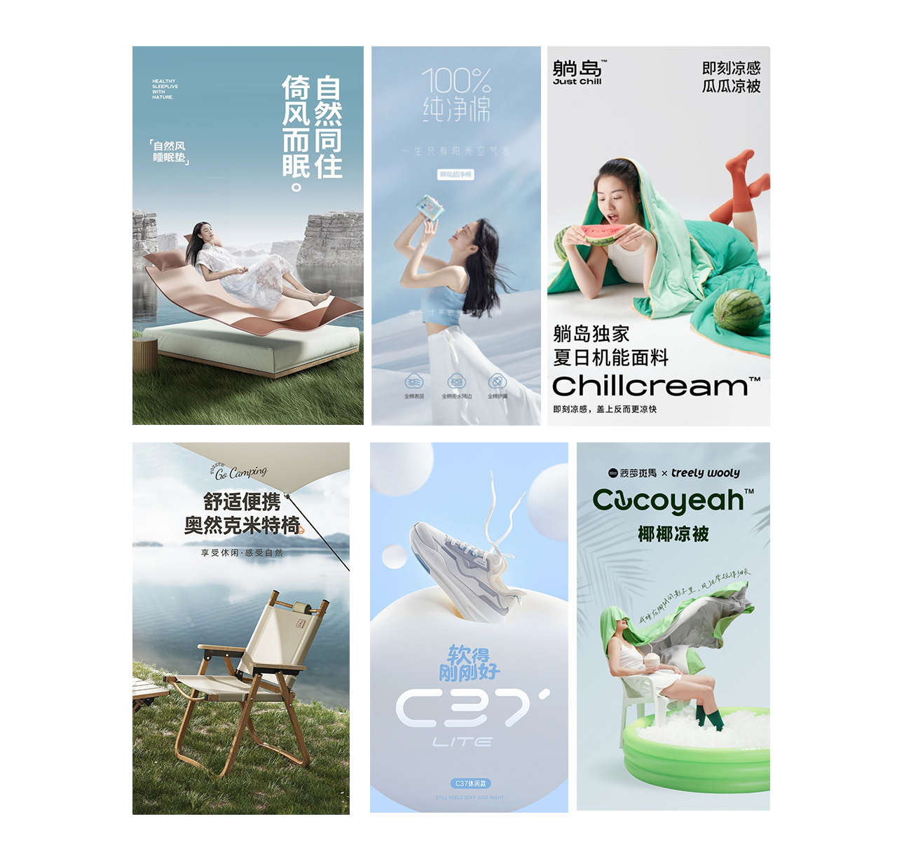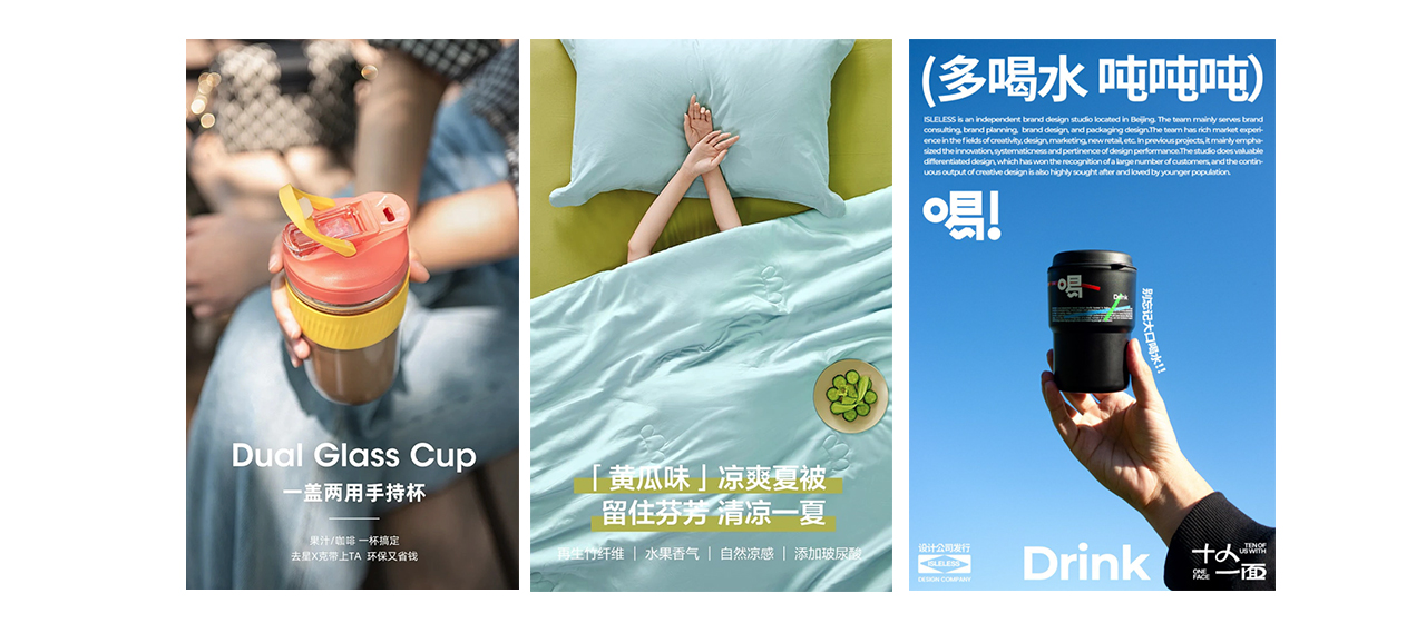 软的,坚固的,舒适的,凉爽,总之,这类产品更注重功能性的表达,把主要卖点可视化,用图像呈现出得到产品使用的感受,从而激发购买欲,更深层次上这也是品牌对生活的一种态度