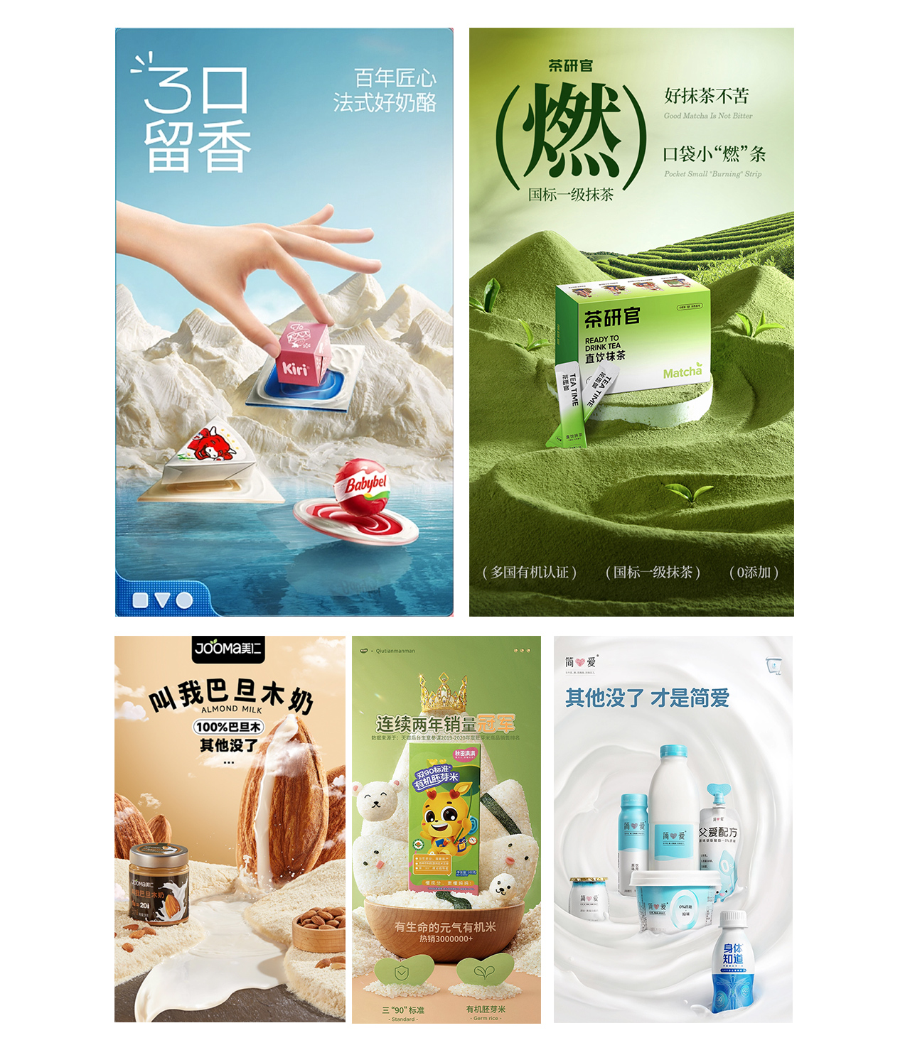 产品创意造型一般适用液态,粉末等,可塑性极强的产品,通过造型让画面视觉更有创意和张力,更注重产品的品质感,在有时间和条件产品又符合的情况下,不妨自己去尝试策划创作一下,很考验自己的创造再塑能力,多尝试对自己提升也快,做出来在的同时很有成就感,大概造型的方向也要与产品有直接关系。奶酪的造型是山,用蓝色的湖水衬托,体现天然的环境,抹茶粉的造型也是茶园感,巴旦木奶也是很直接了当的说明,简爱主要突出0添加,背景也是用奶的造型做的0