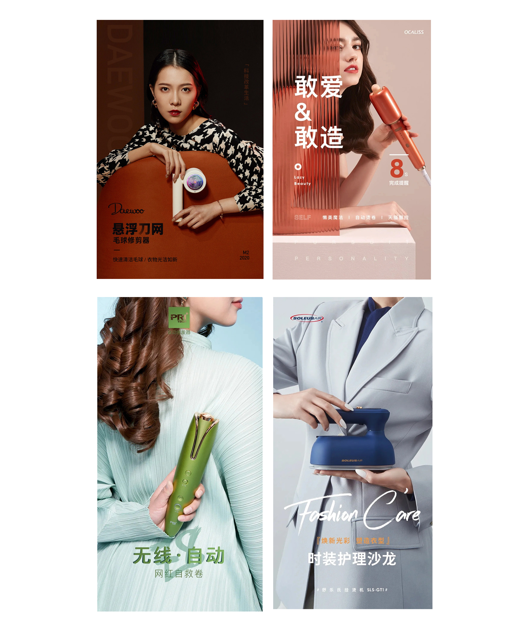 背景太复杂,我们就需要简化,产品颜色深我们就用浅色背景衬托,产品颜色浅就用深色背景衬托,减少视觉不需要看到的部分,凸显出产品,同时背景也要与产品有联系,像卷发棒,熨斗,修毛器都是用了产品使用之后达到的效果说明,而且模特的穿搭气质也跟产品的使用人群相关的