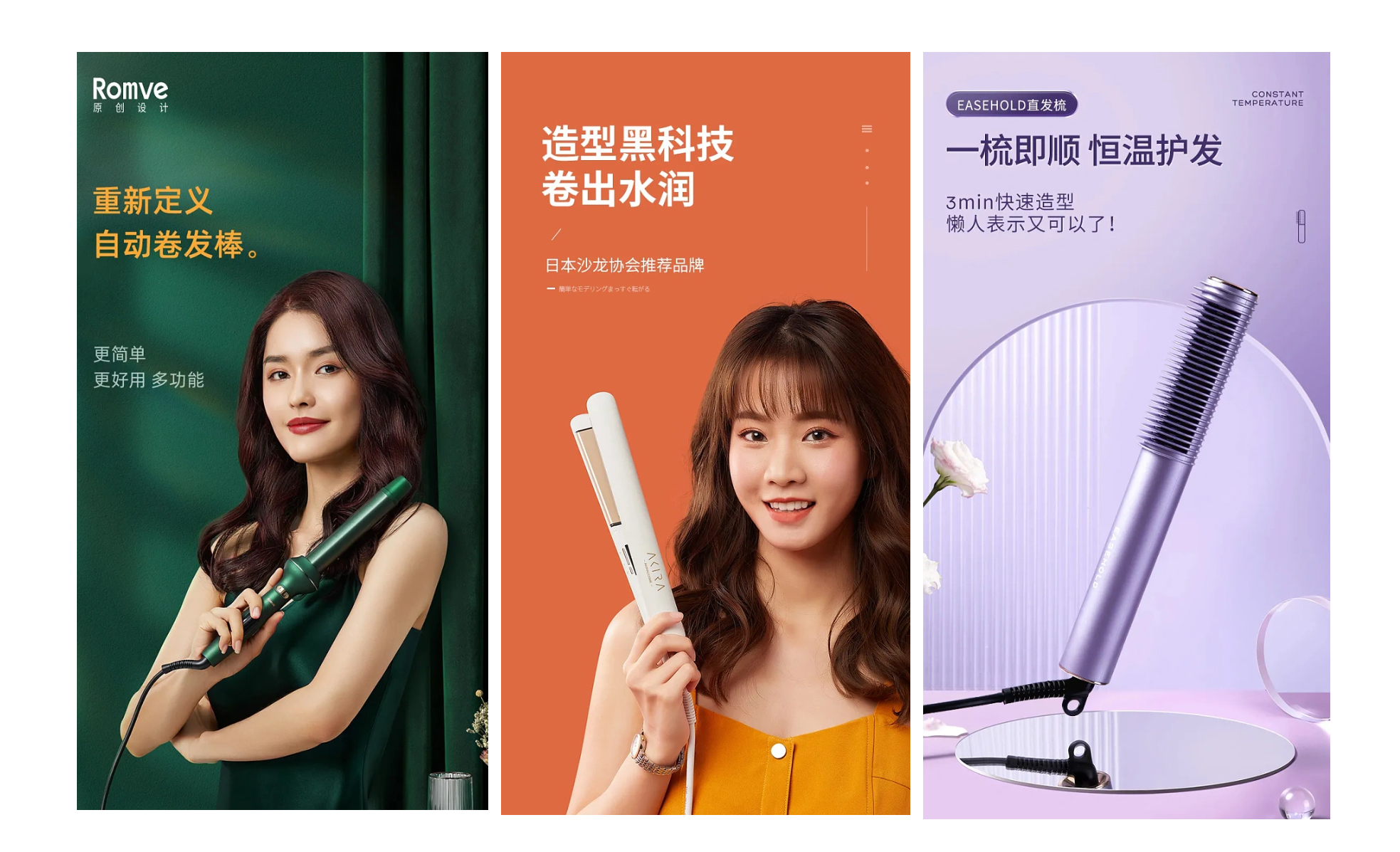 你看,同样是卷发棒,虽然也引入了模特,但是层次没有拉开,视觉注意力很容易到模特脸上,构图上重心也比较靠下,画面下沉,颜色也没有深浅对比,产品就弱化了,视觉上传达就往往需要更多时间。图3只是一个产品这样显得就很呆板,不过有些时候公司的条件预算有限,也是没办法的事,我们只能根际实际情况选择一种相对表现最好的能落地的方式