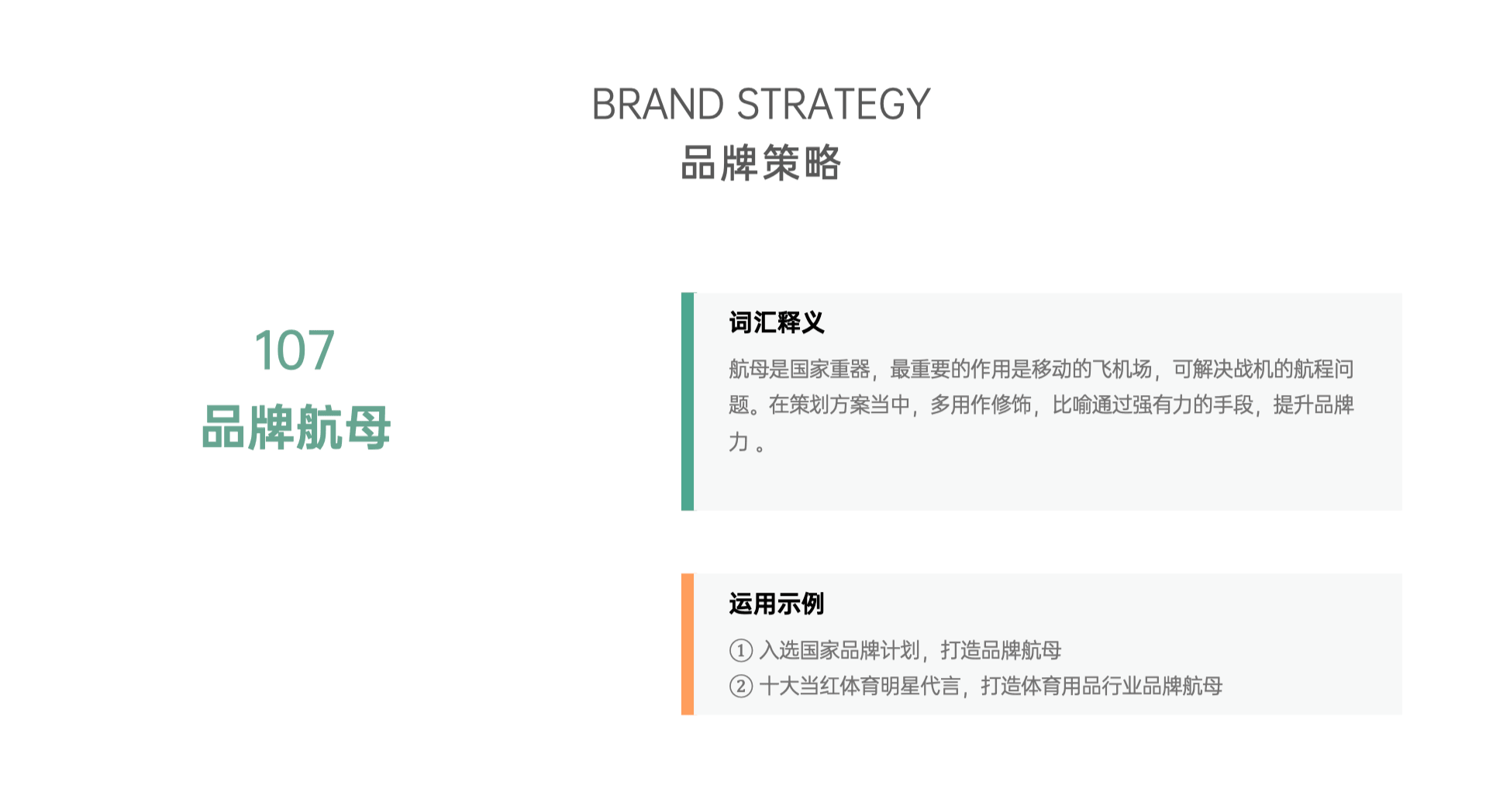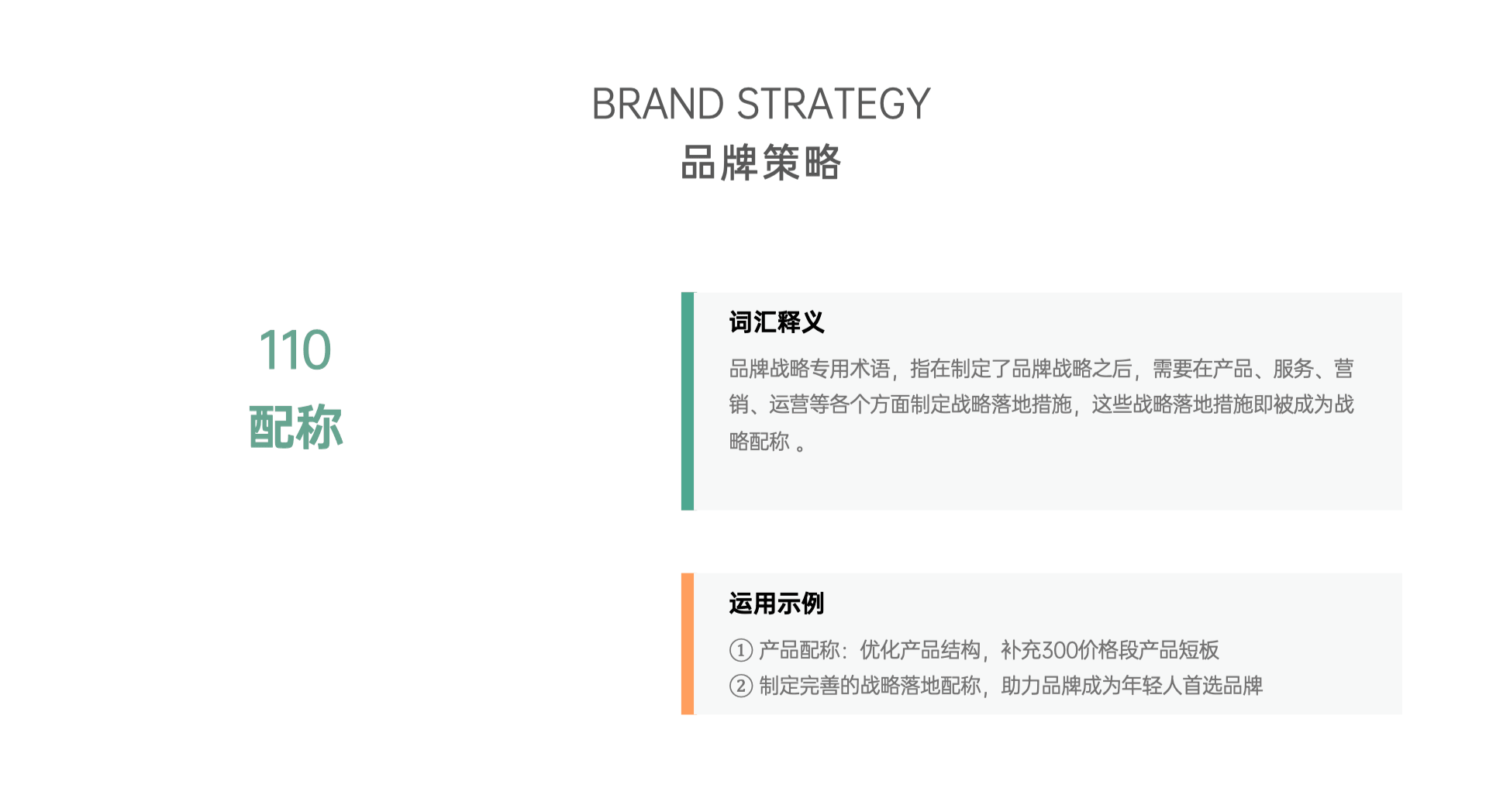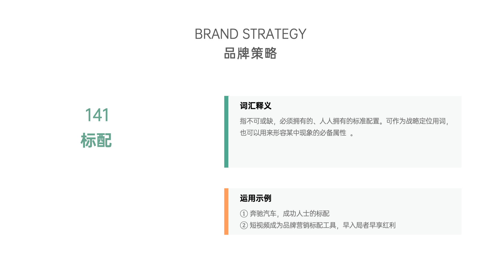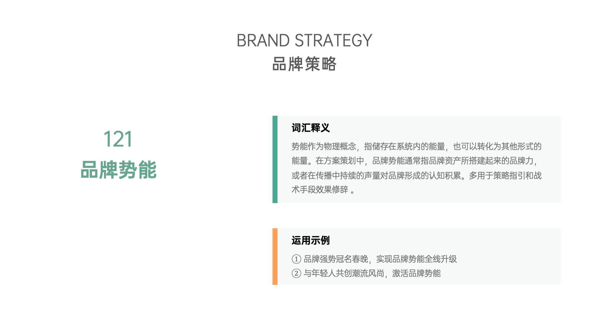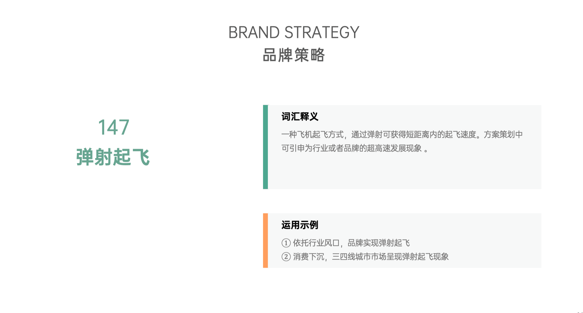 策略词汇大全,包括:市场策略、品牌策略(99-148)、传播策略、渠道策略,共230个词汇。部分词汇适用于各个板块,而非限定某一块,据实际汇报场景和受众情况酌情灵活使用,切不可生搬硬套。致谢策略人藏锋。