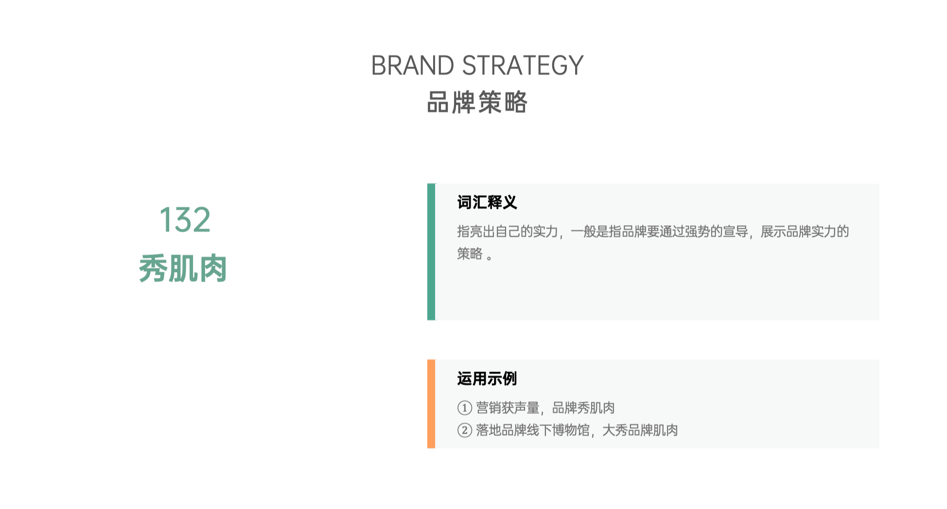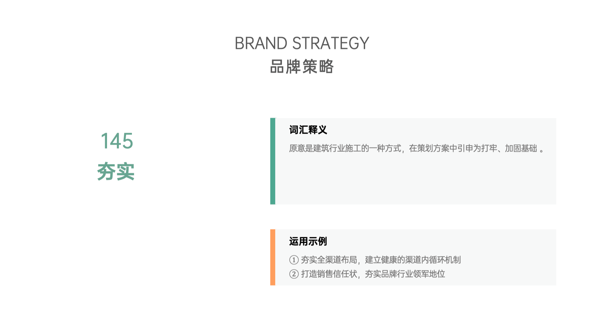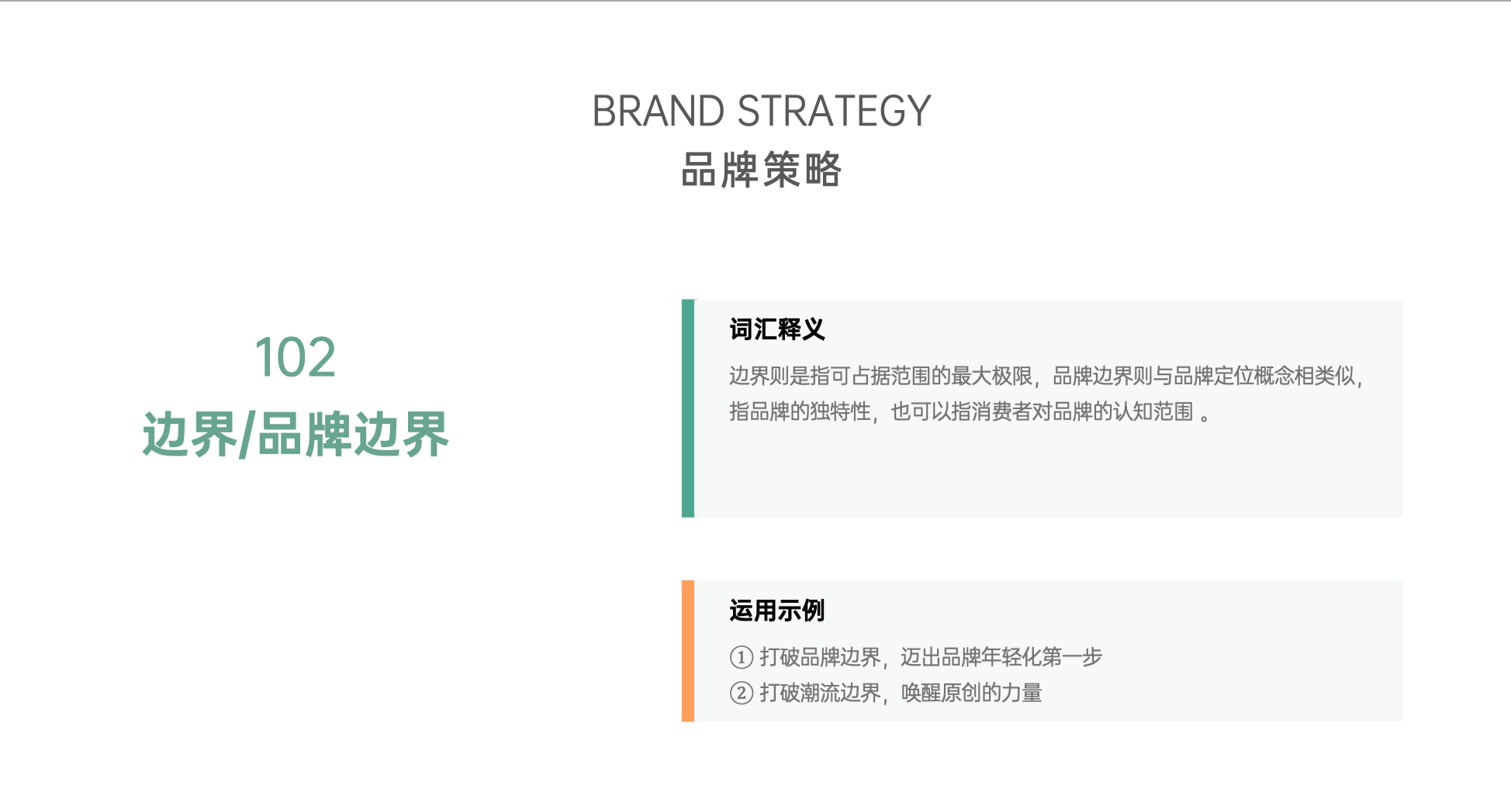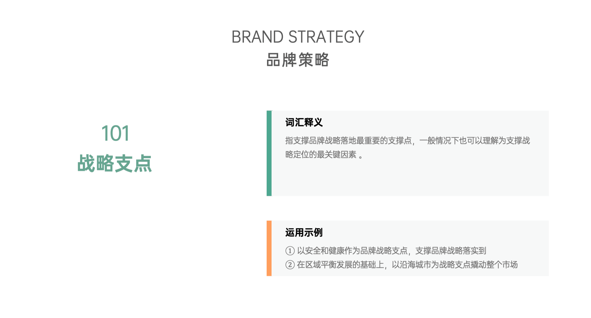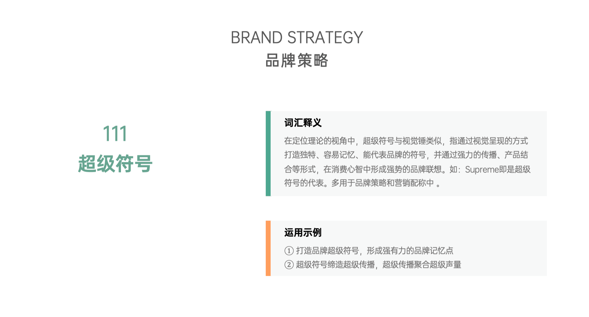 策略词汇大全,包括:市场策略、品牌策略(99-148)、传播策略、渠道策略,共230个词汇。部分词汇适用于各个板块,而非限定某一块,据实际汇报场景和受众情况酌情灵活使用,切不可生搬硬套。致谢策略人藏锋。