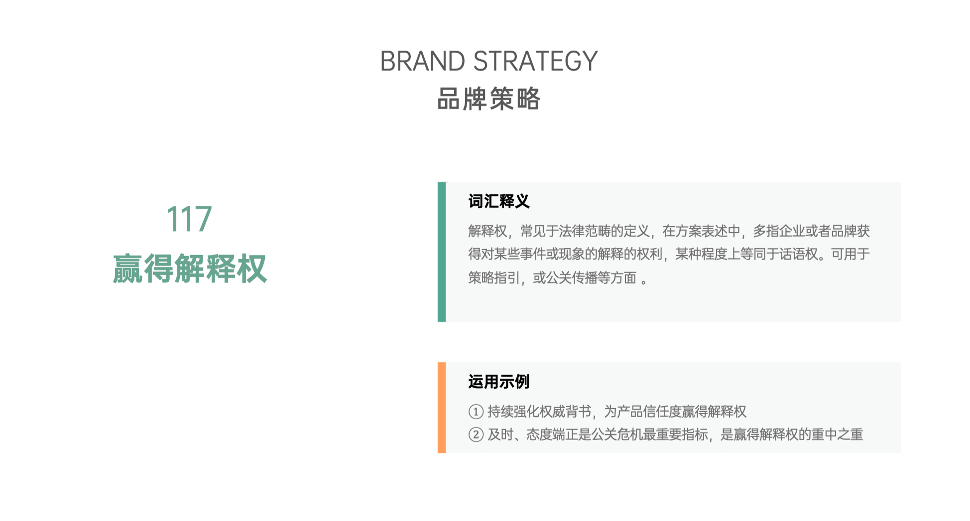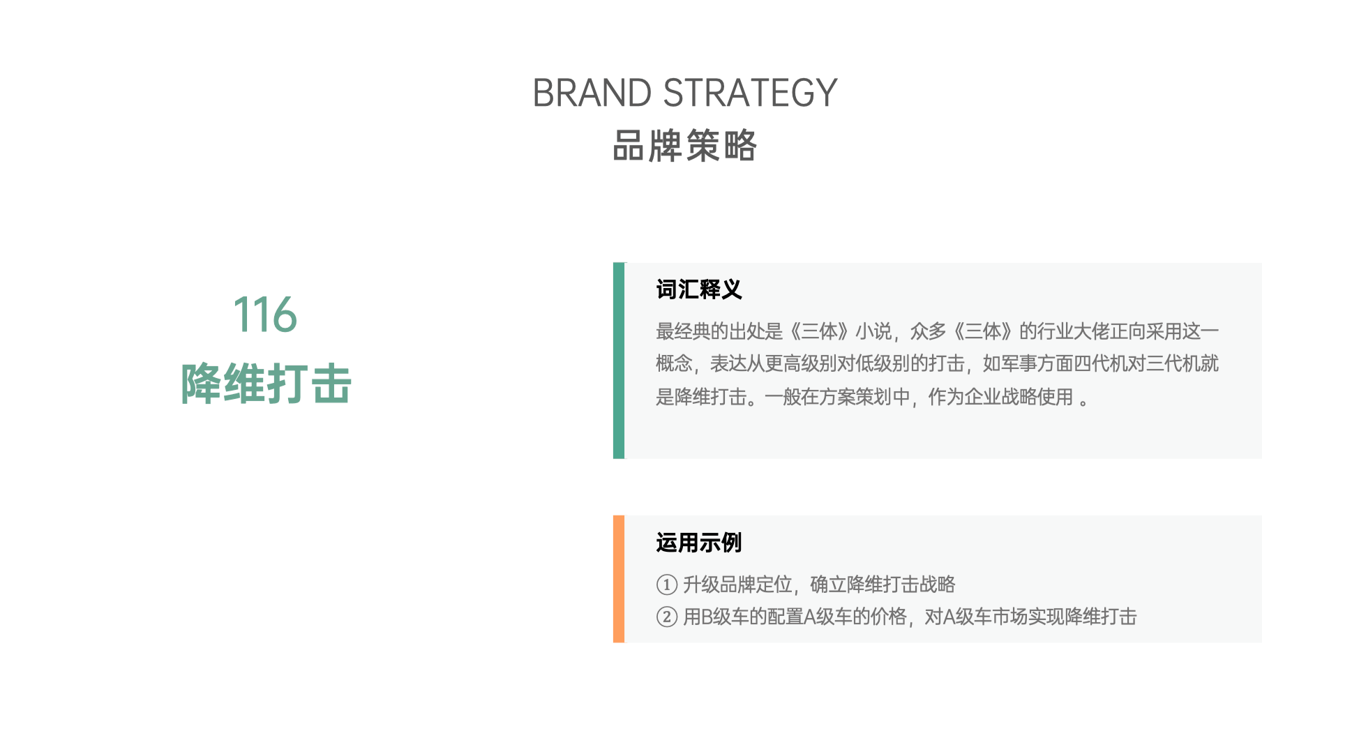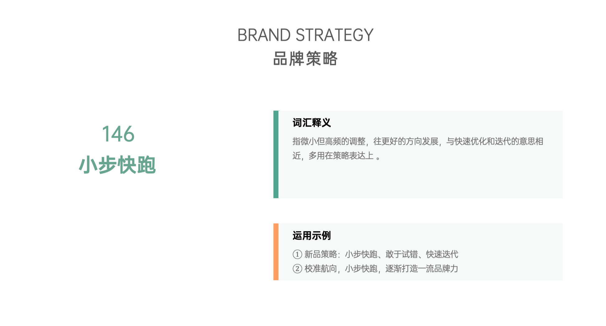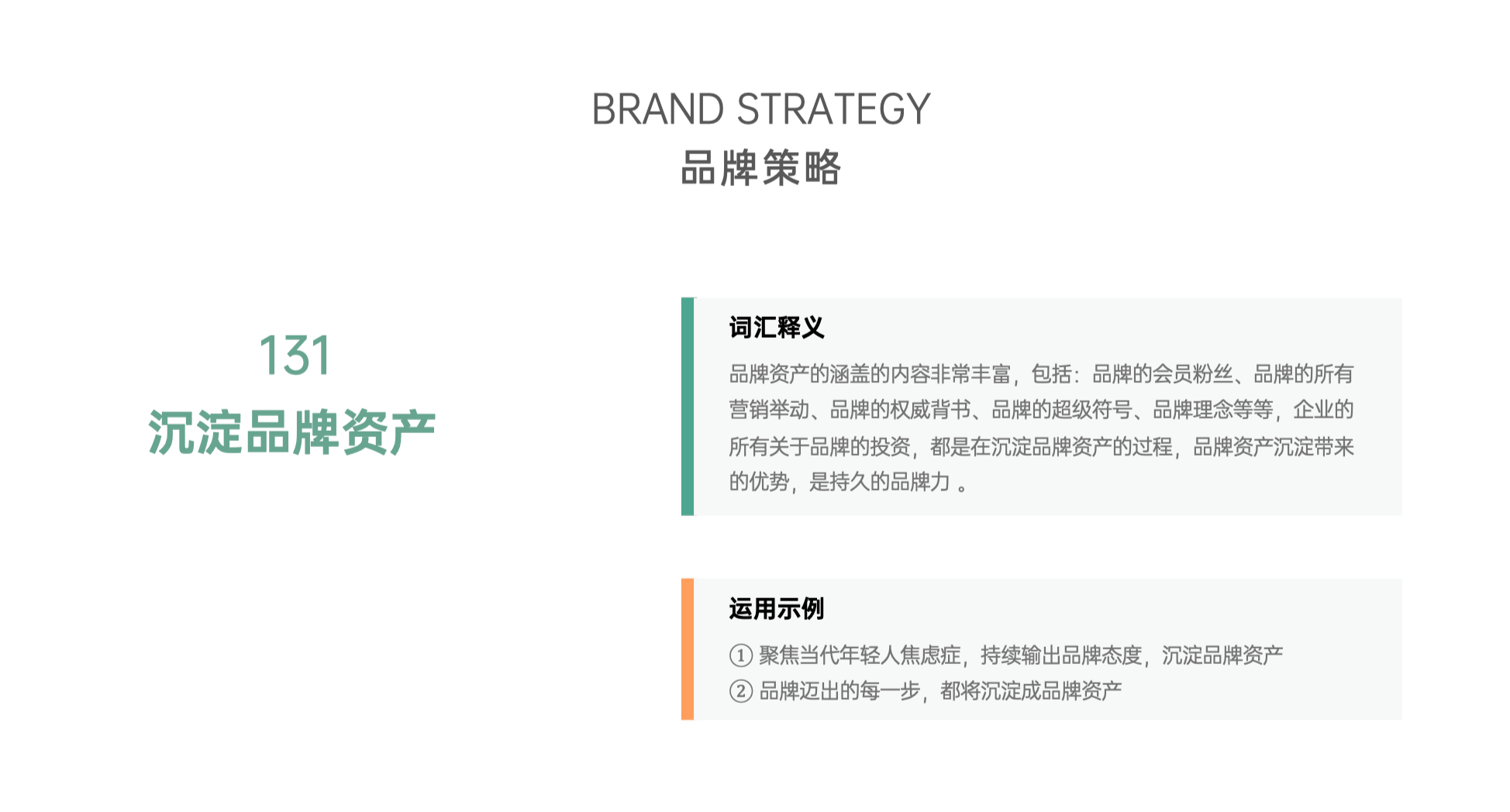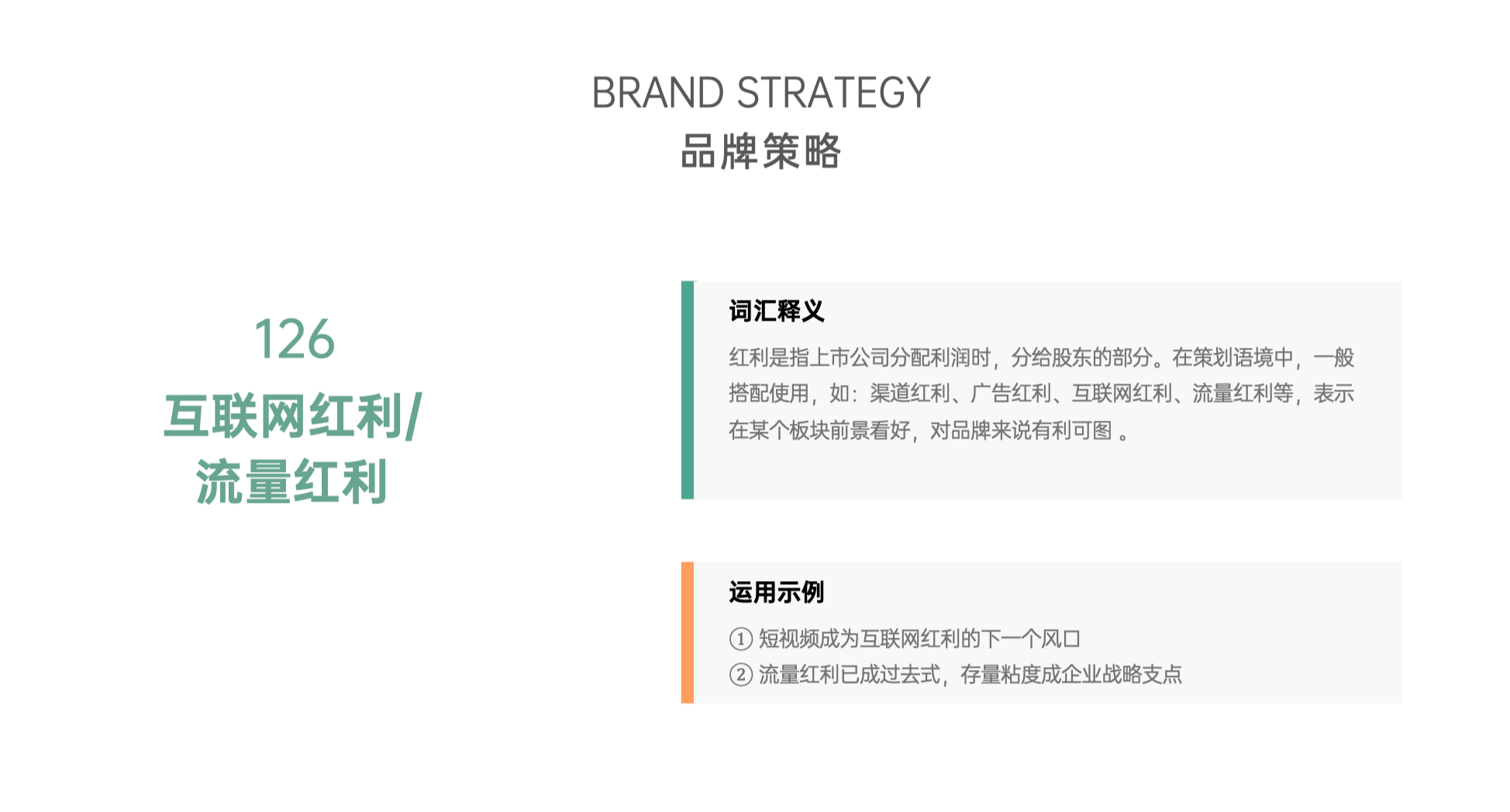 策略词汇大全,包括:市场策略、品牌策略(99-148)、传播策略、渠道策略,共230个词汇。部分词汇适用于各个板块,而非限定某一块,据实际汇报场景和受众情况酌情灵活使用,切不可生搬硬套。致谢策略人藏锋。
