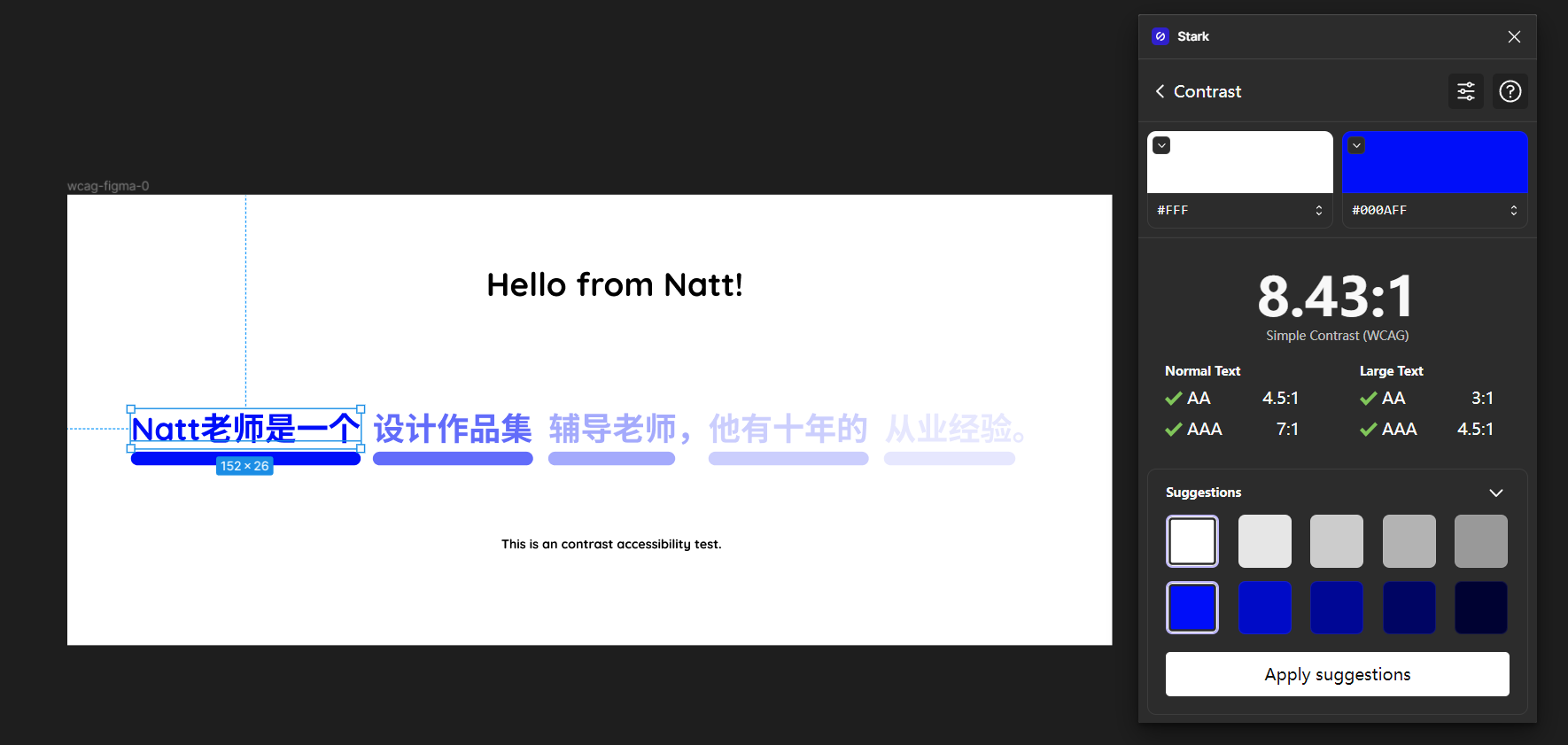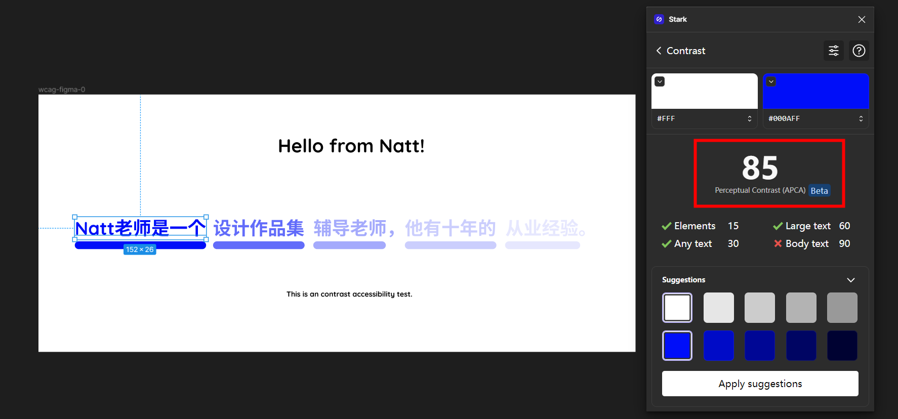 在选择文字/或两个色后,Stark的Contrast就会展现出目前的WCAG情况。Stark 的另外一个好处是,它可以把WCAG标准切换到APCA标准: