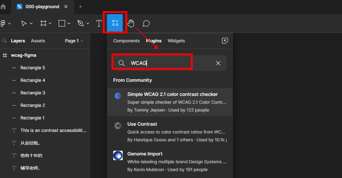 Figma 本身并没有WCAG检查工具,但是好在Figma足够开放,我们在Figma Plugin 里随便一搜,都是各种检查器:
