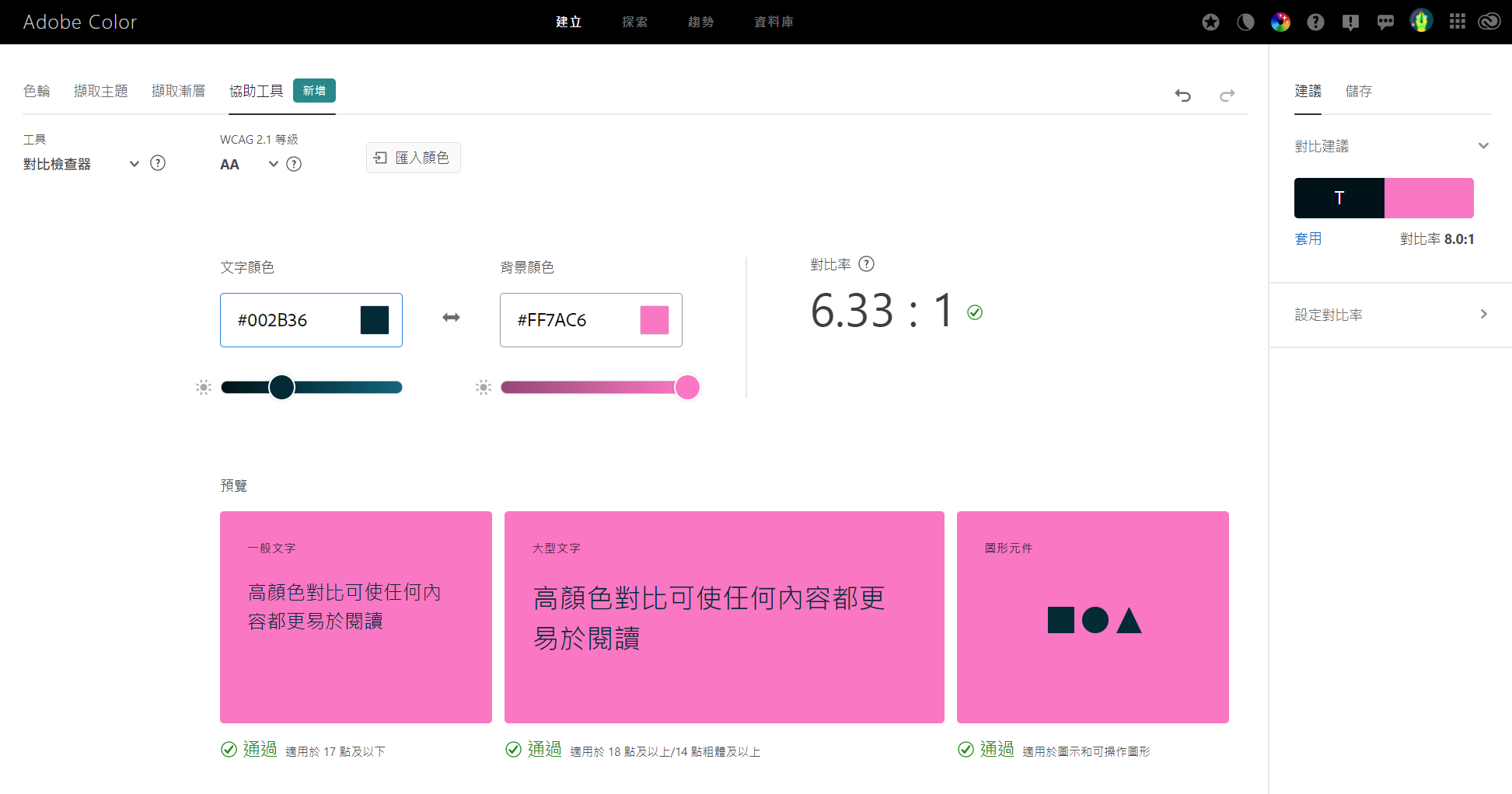 而如果我们进入 Adobe Color 网站,则可以看到它新增了颜色检查,比如我们把黑色和猛男粉放在adobe color 检查器内看看是否符合 WCAG 2.2下的 AA 标准: