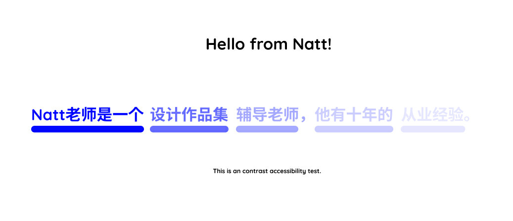 我们可以非常肉眼可见地描述视觉元素的对比程度,比如上图中最强的 Hello from Natt 是视觉中最强的对比,纯黑白的对比,而下方蓝紫色句子,对比一点点减弱。