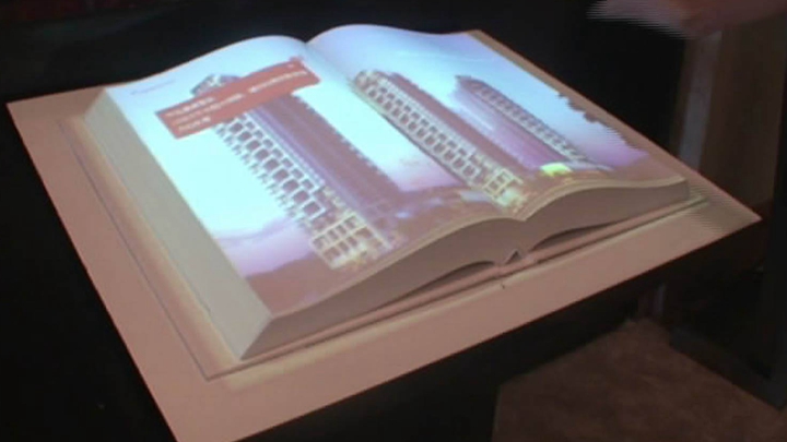 虚拟电子书犹如一本打开的书籍,里面可以记载丰富的资料,包括动画、视频、图片等内容。参观者可以挥动手臂“翻阅”书籍,自左向右或者自右向左,快速找到想翻阅的内容,就像翻阅一本普通的杂志一样,这就是虚拟翻书系统带来的惊喜!这种虚拟翻书形式新颖,视觉冲击力强,给人以神奇感,而且可以展示的信息量大。以下是它的两种形式: