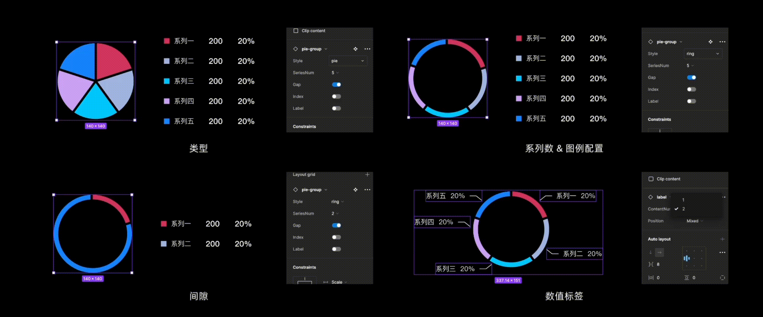 - 由于没有更多辅助信息帮助数据表达,饼图、环图的图例相较于轴类的图例被寄予了更高的期望;除了图标与类目文本外,供给使用者是否显示类目对应的占比以及实际数值情况,其约束方式最大程度上保障图表元素间的平衡,若整体拖拽比例较大时,需要手动校准;