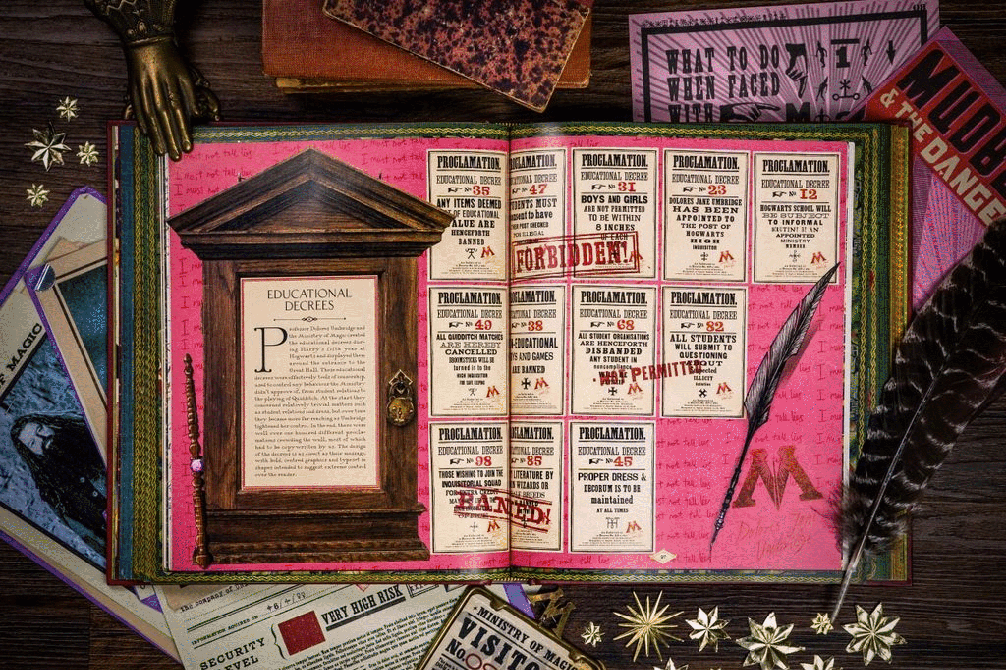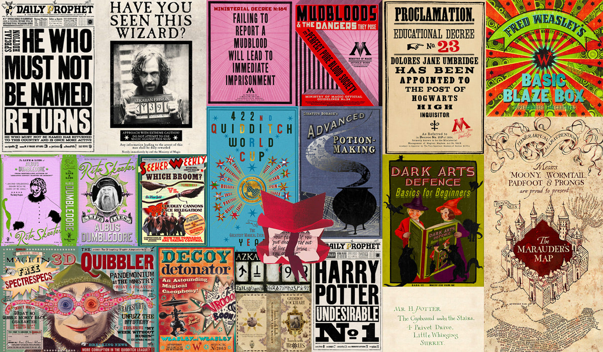 自2001年起,MinaLima接手《哈利波特》系列电影的道具设计工作,将J.K.罗琳笔下的描述性文字转化为电影中的一件件道具,设计出电影中所呈现的海报、包装、信封、报纸杂志、活动地图、教科书、围巾、挂毯以及其他标志性道具,将电影中少有留意的细节通过一件件道具塑造出一个真实的魔法世界。