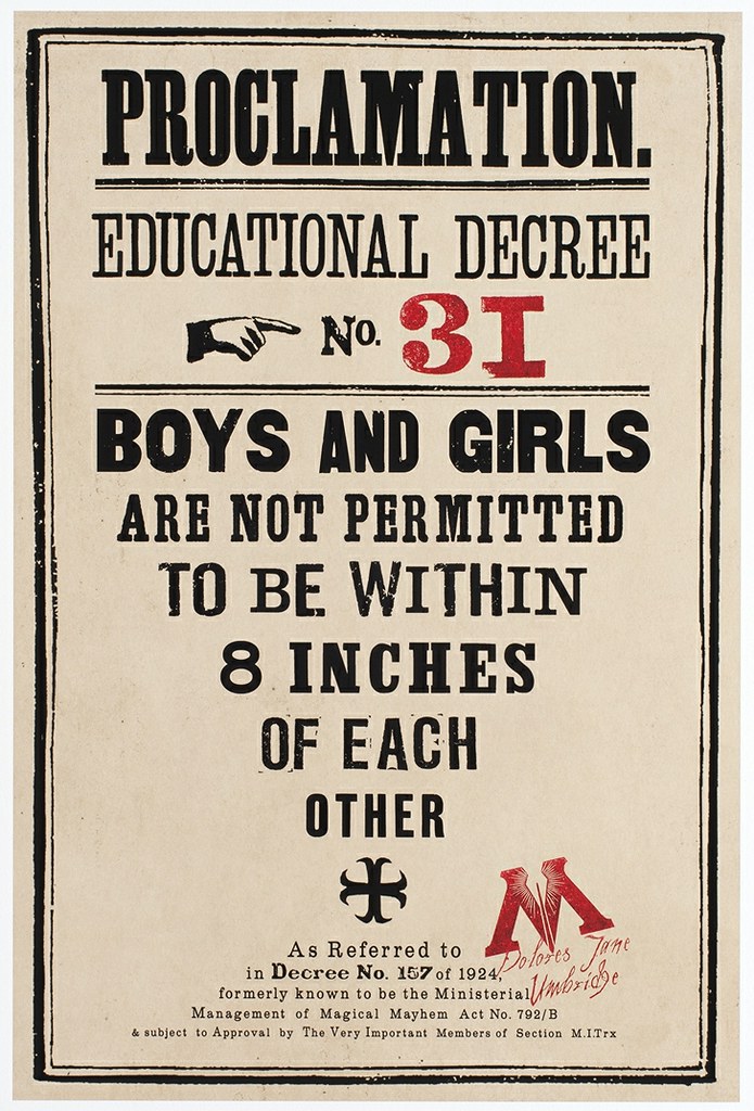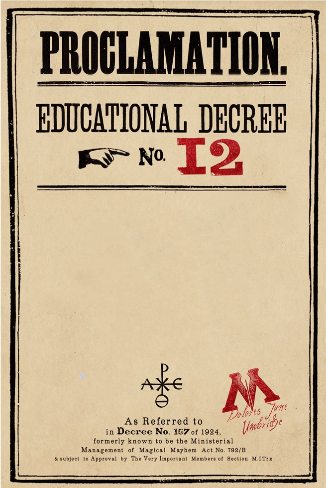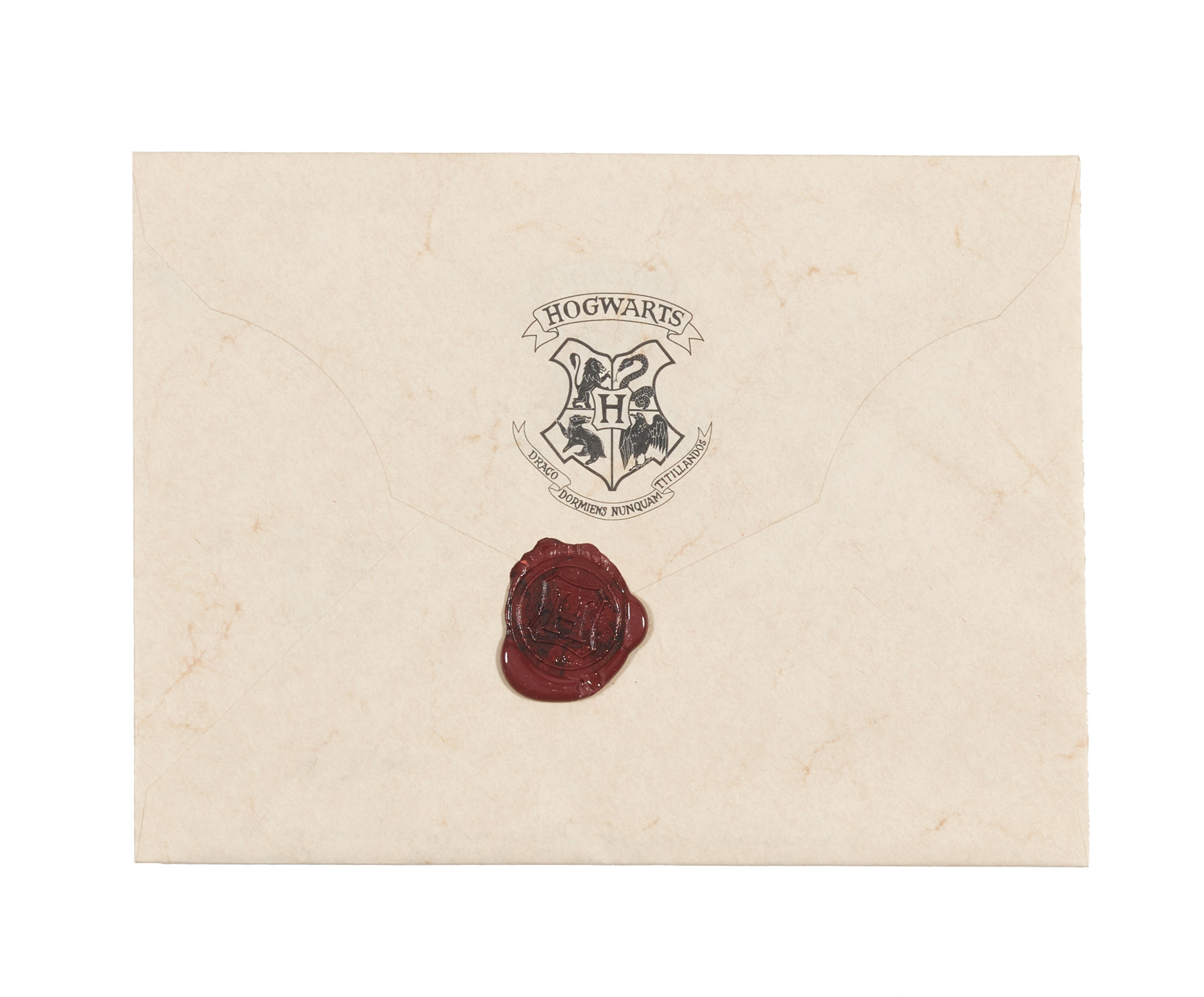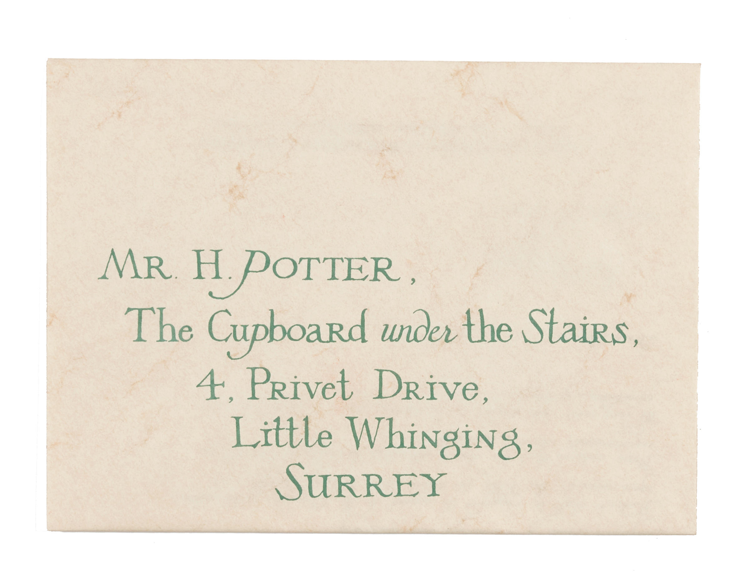 平面设计师Miraphora Mina为《哈利波特》设计的第一个道具就是霍格沃茨的入学通知书,通知书的信封上用复古华丽的绿色墨水写道:“Mr. POTTER,The Cupboard under the Stairs”,并在信中注明了入学需要的魔杖、教科书、巫师袍子、坩埚等,最后附上了麦格教授的签字