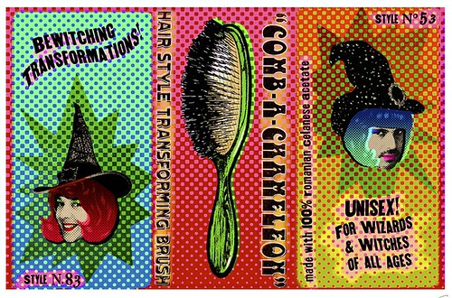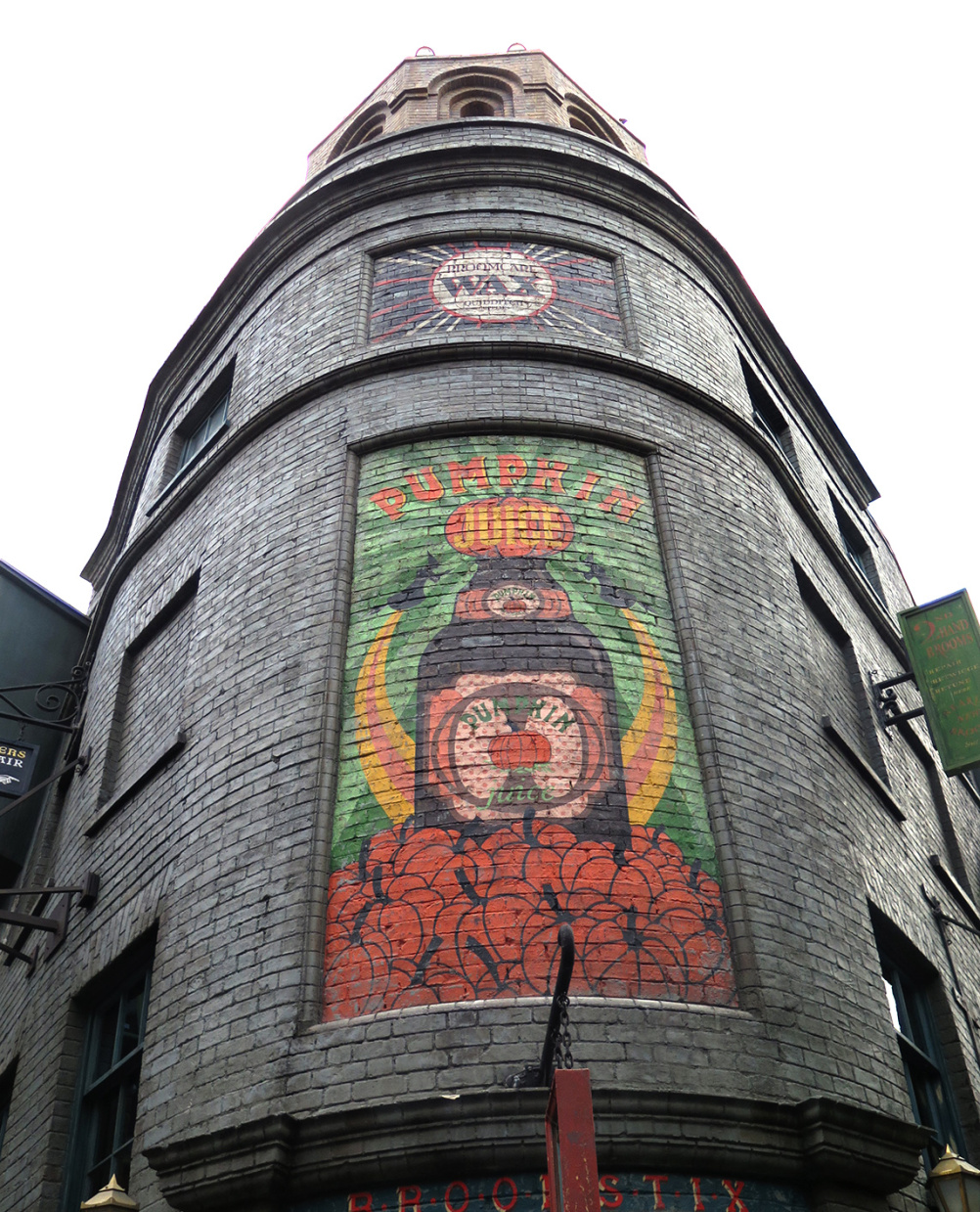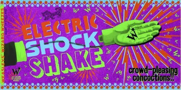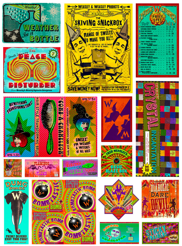 工作室MinaLima在《哈利波特》系列电影中投入精力最多的莫过于4层楼高的韦斯莱笑话商店,曾花了将近六个月的时间设计了数百个产品包装以扩大商店空间,参考上个世纪八九十年代的中国食品包装进行设计改造,并在设计思想上体现韦斯莱双胞胎的特质,呈现出两个热心创业的少年巫师的创意。