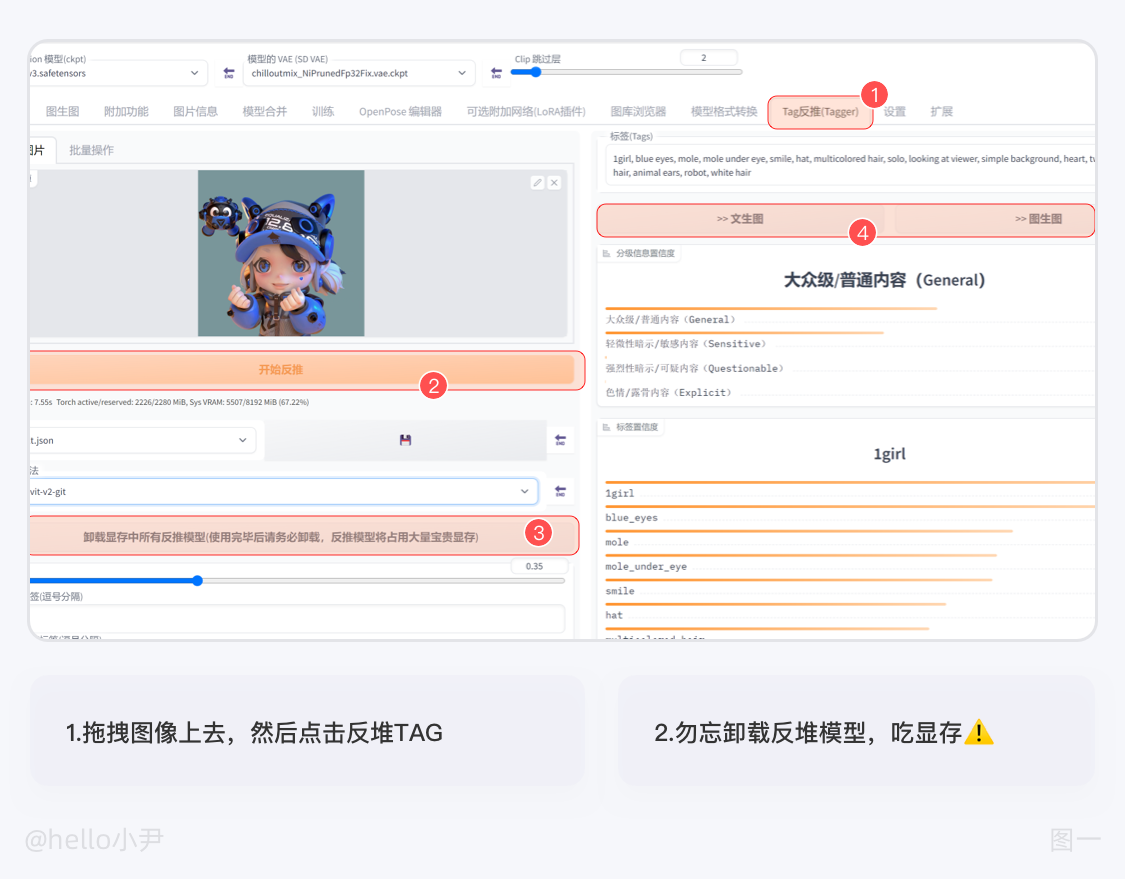 Stable Diffusion 中自带反堆功能,可以通过将想要拆分的图像拖入反堆,点击按钮来获得生成该图像的提示词。第一次使用可能会有些慢,需要稍等片刻。需要注意的是,这些提示词需要进行后期的优化,常用的方法是通过百度翻译后进行增删改,或者输入到 GPT 中进行优化,优化后将提示词放入相应的框内进行图像输出