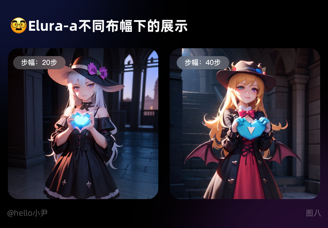 下图展示elura a同提示词不同步幅下的输出图像,可以看到步幅越高,细节刻画越好