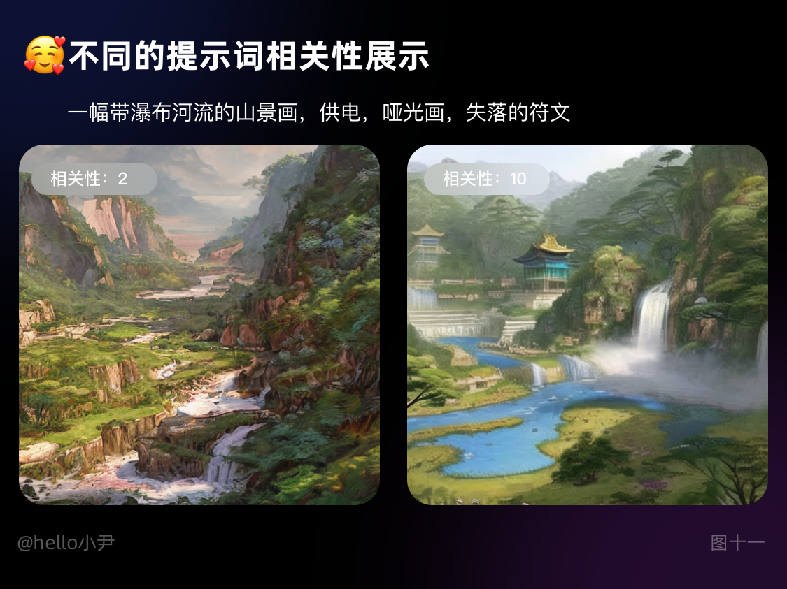 而对于建筑等大场景类的提示词,一般控制在3-7左右。这样可以在一定程度上突出随机性,同时又不会影响生成图像的可视化效果。因此,提示词相关性可以帮助我们通过引导模型生成更符合预期的样本,从而提高生成的样本质量。