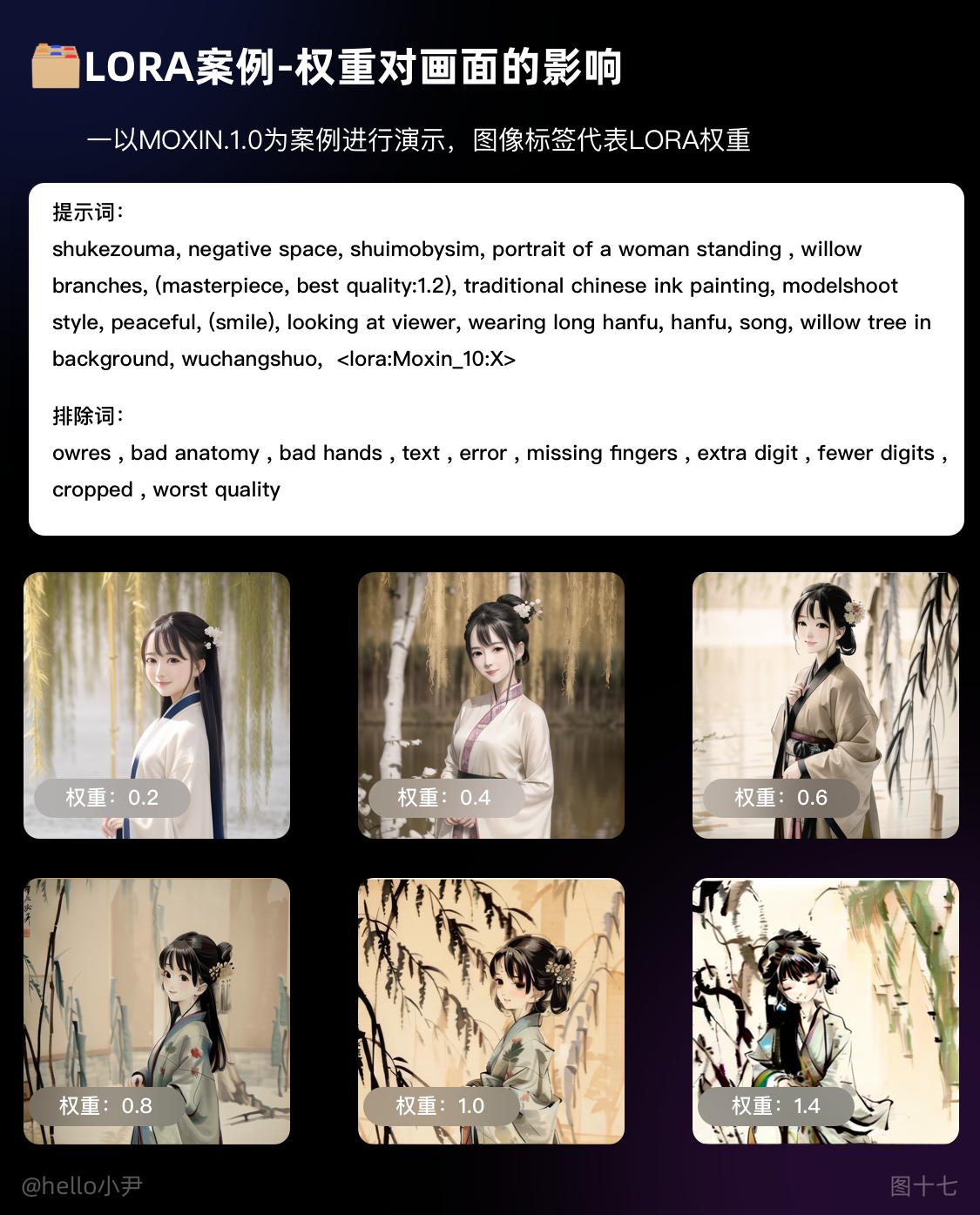 通常来说,每个 LORA 模型都有对应的底膜和触发词汇。我们可以查看 LORA 作者产出的相关图片,从中获取模型信息,并从中选择一些提示词和排除词来指定生成图像的方向。需要注意的是,每个 LORA 模型对输出图像的权重设置是非常重要的。权重设置越大,对画面的影响因素就越浅。通常情况下,权重应该控制在 0.7-1 之间。如果权重过高,会大幅度影响出图的质量。