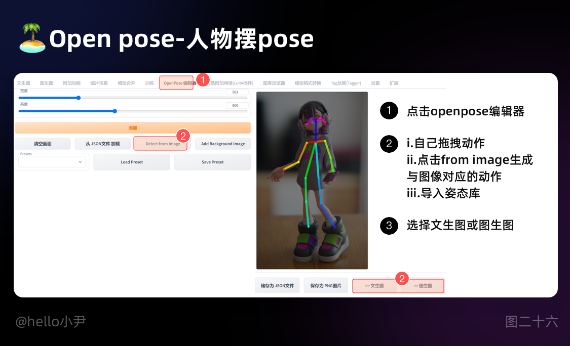 判断主图的主体动作,然后将动作附加在主图上 一般配合着open pose editer