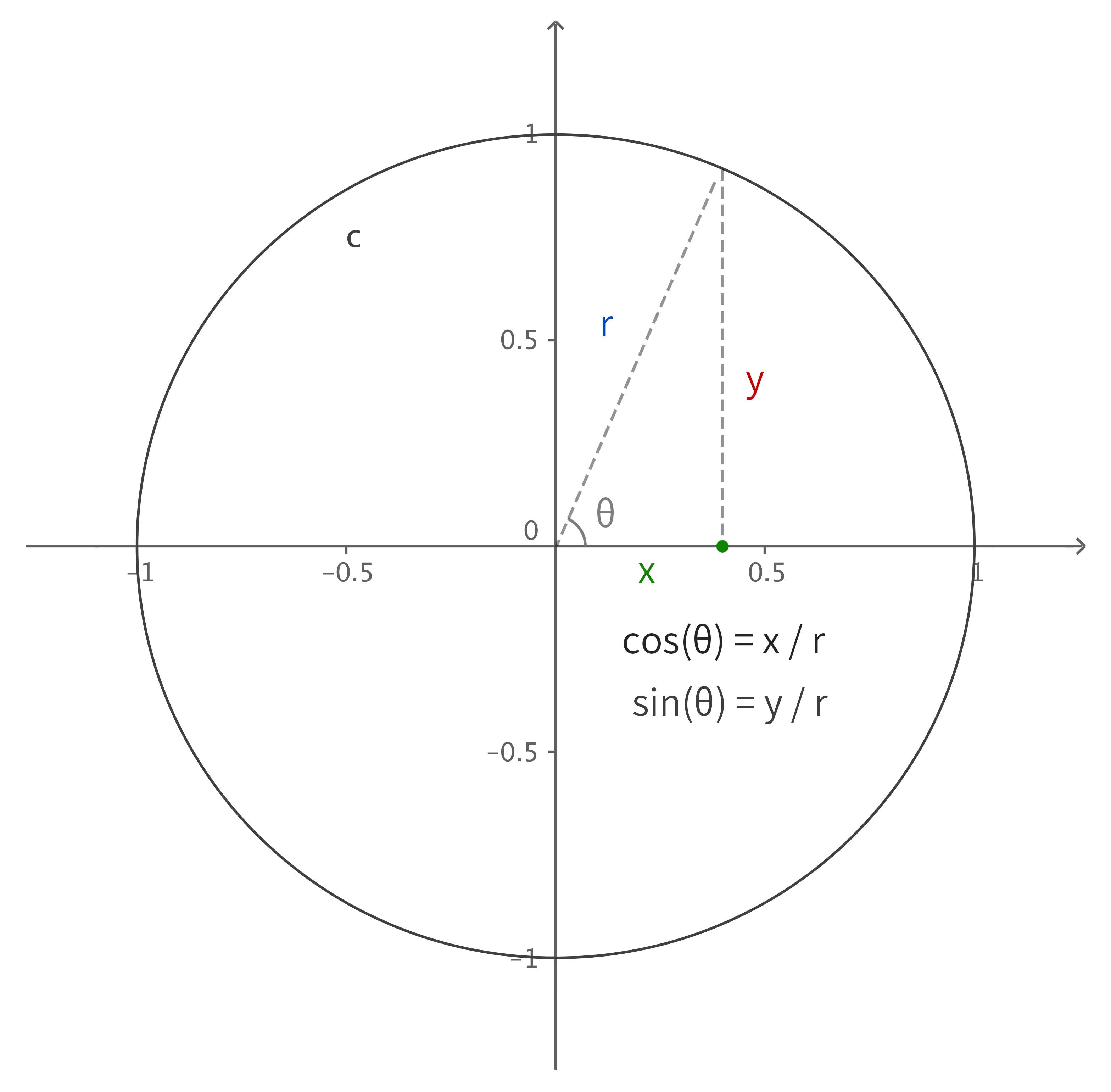 可能又有人会好奇,为什么这样就能表示圆的轨迹呢?根据三角函数的定义其实是不难推出的。sin 函数是对边与斜边之比,cos 函数是邻边与斜边之比。无论圆周上的点位置在哪,r(半径)都是不变的。因此可以得到 x 坐标与 y 坐标的表达式