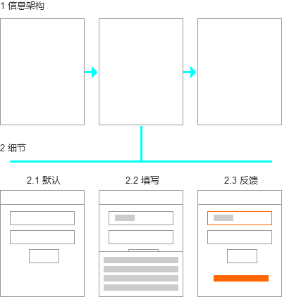 设计分两步走,分别是信息架构设计和细节设计,细节再从默认状态、填写状态、反馈状态三个角度进行设计。