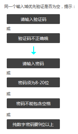 什么意思呢?多数做法是,提交时先针对某一类问题全局检查一遍,比如是否为空,等都不为空了,再对下一类问题检查一遍,比如格式。这样的结果就是用户可能因为一类问题,填完一遍表单,又因为另一类问题,从头到尾来多一遍,整个过程在多个输入项之间来回切换。而我不想让切换这个事情导致用户焦点来回,于是,就做了这么一个决定。先验证第一个输入域,比如这里的“验证码”,一定是验证码不为空且正确了,才开始提示下一项“密码”,也就是: