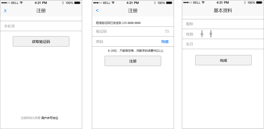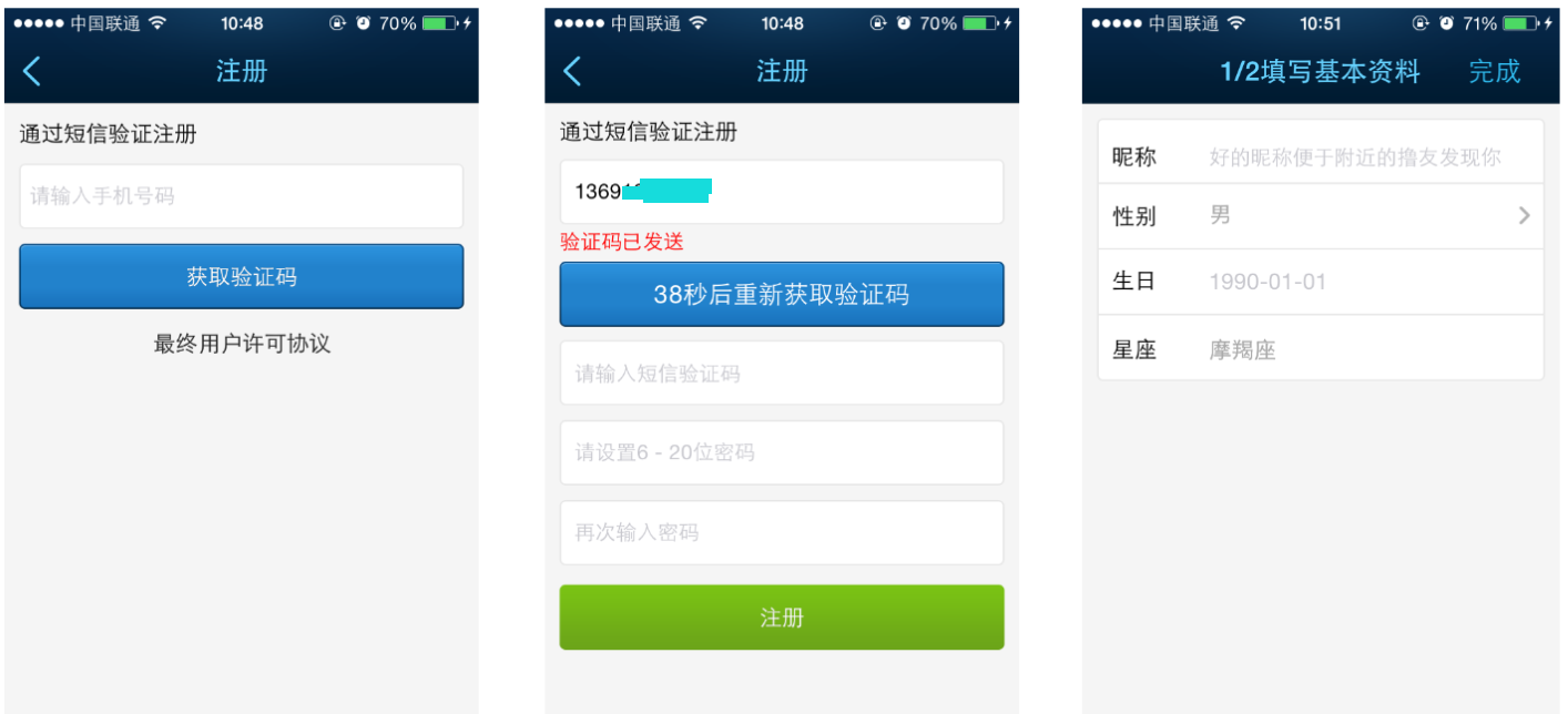 细心的人也许会问,为什么中间一步是密码和验证码,且最后一步没有返回按钮呢?其实这是一个技术上的约束造成[6]。首先,对于我们系统来说,手机号一旦验证(验证码一旦正确提交),手机号就不能再被使用,而完成注册还得搭上密码,所以验证码和密码得同一个动作提交给系统,不能分成两步,验证码如果单独作为一步先提交,也就是手机单独被验证,中间若发生非常规退出,密码还没填,下次再想注册就会被提示手机已被占用了。其次,在第二步填完验证码和密码后,其实已经注册成功啦,也就是说,用户在第三步就把应用强制退出,下次回来也能够凭手机号和密码登录啦,当然登录完第三步的基本资料填写还是会等着他,跟他说未完待续。这也就是为什么第三步基本资料没有返回修改密码验证码的入口,看上去怪怪的,但游戏规则就这样,如果你有好办法,记得告诉我。